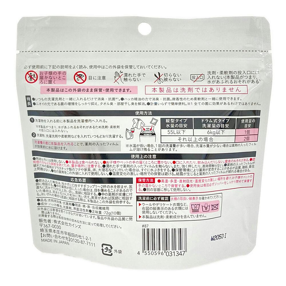 ●いつもの洗たく洗剤と一緒に入れるだけで消臭・抗菌(すべての菌を抗菌するわけではありません。)●ハッカ精油のチカラで消臭・抗菌!微香性のため柔軟剤と一緒にご使用いただけます。●ニオイの元である菌の増殖をしっかり抑え、タオル臭・部屋干し臭を解消!