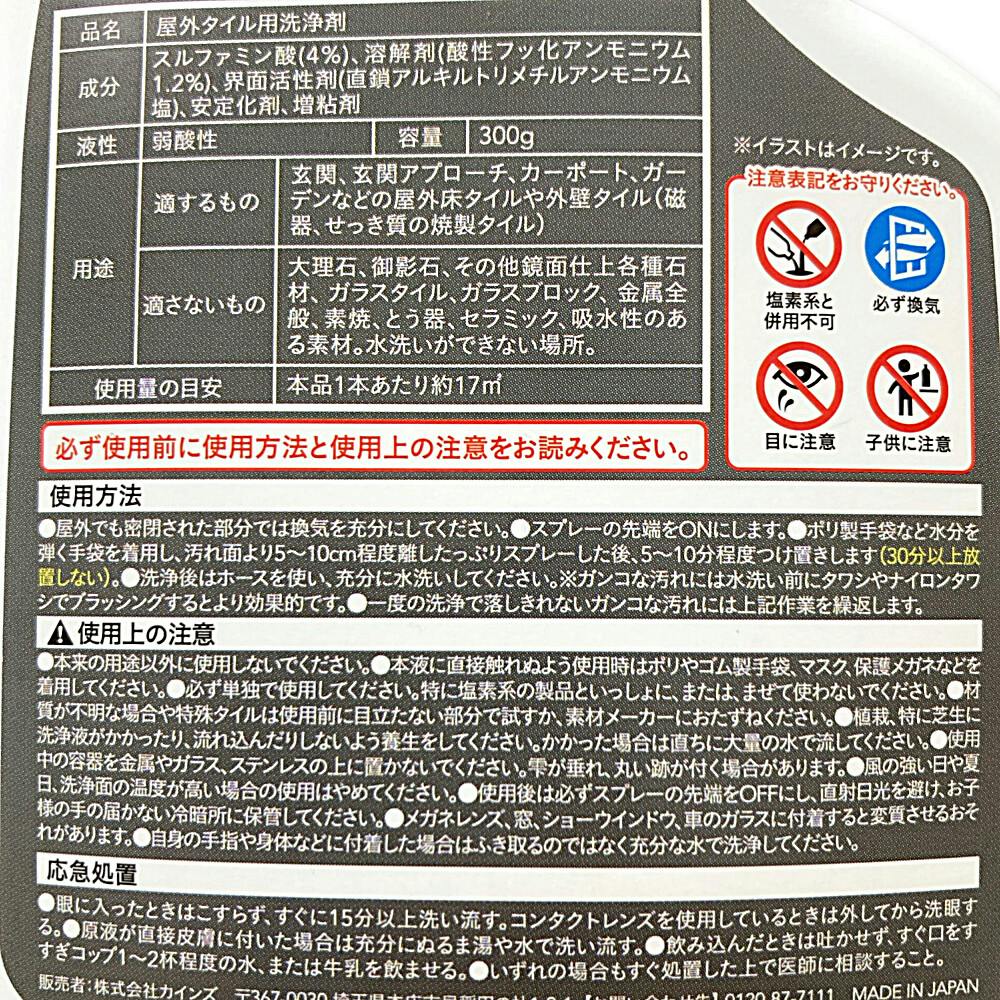 ●用途以外には使わない。●本液に直接触れぬよう使用時はゴム手袋、マスク、保護メガネ等を着用して下さい。 ● 必ず単独で使用する。 特に塩素系の製品といっしょに又は、 まぜて使わない。 ●材質が不明な場合や特殊タイルは使用前に目立たない部分で試すか、 素材メーカ