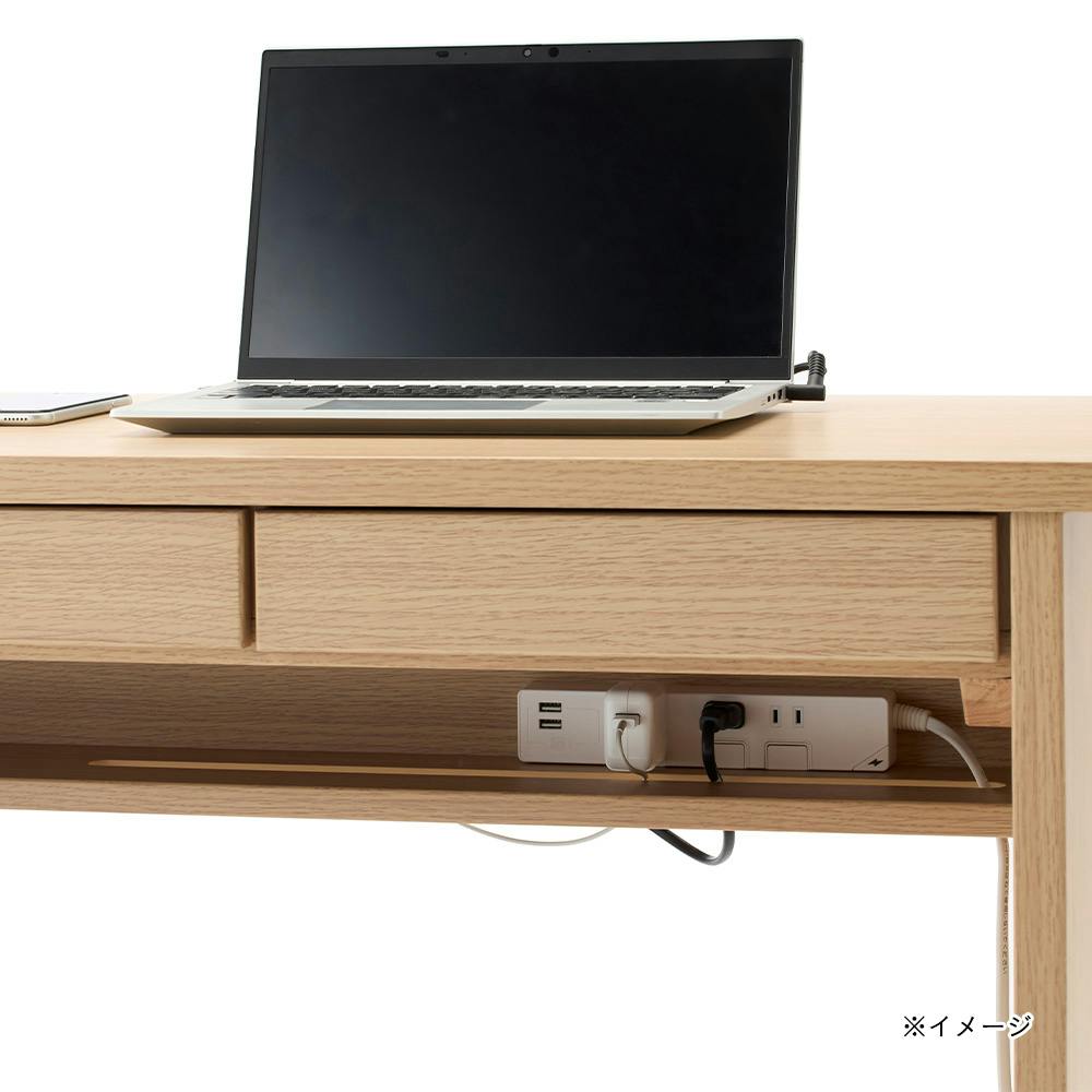 コンパクトな奥行きとゆったりした幅のサイズ感。 3つのトレー収納で、こまごましたものを整理整頓できる。 背面板の内側の板にスリットがあるので、配線コードやティッシュを差し込める。ちょっとした小物の置きに。