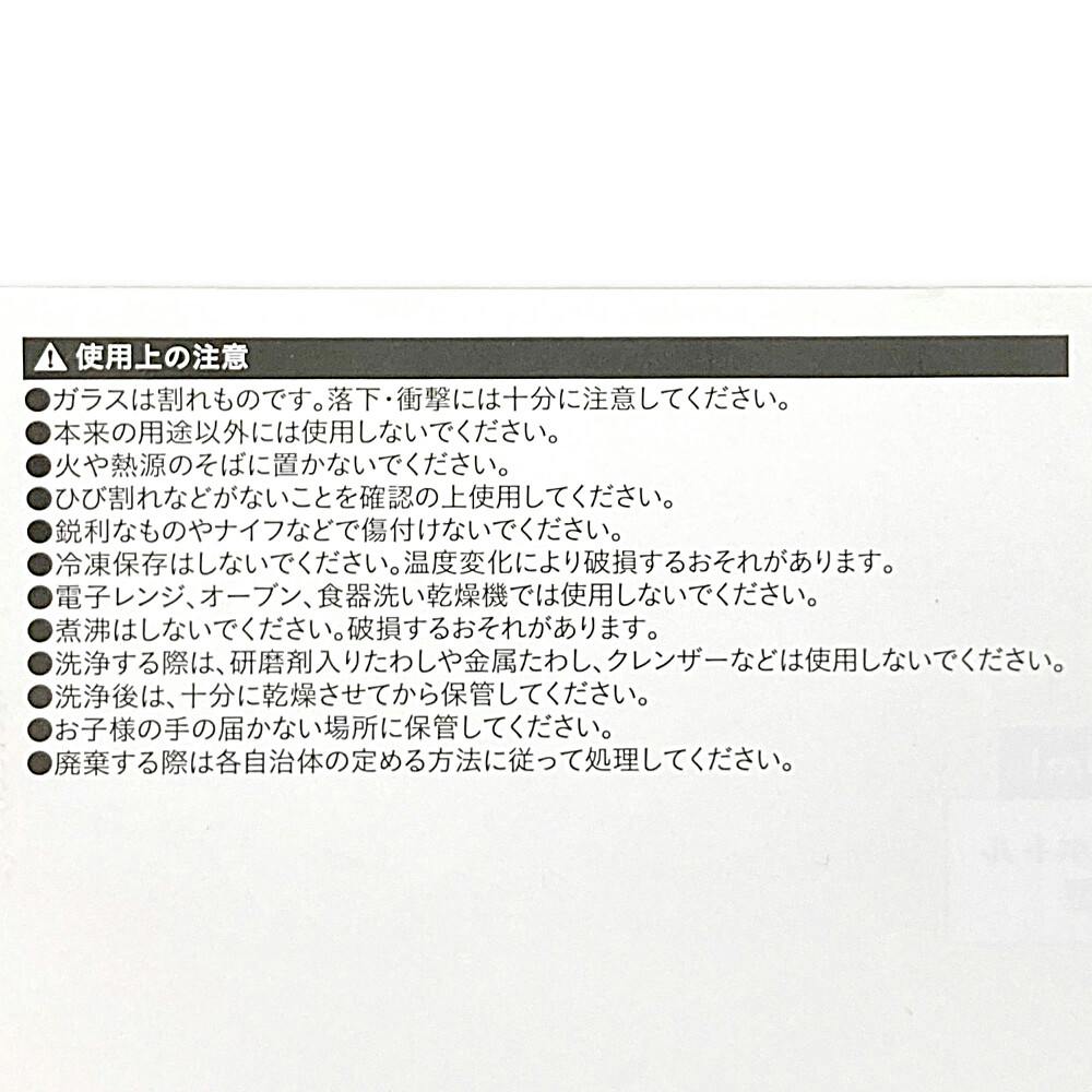 ●ガラスは割れものです。落下・衝撃には十分に注意してください。●本来の用途以外には使用しないでください。●火や熱源のそばに置かないでください。●ひび割れなどがないことを確認の上使用してください。●鋭利なものやナイフなどで傷付けないでください。など