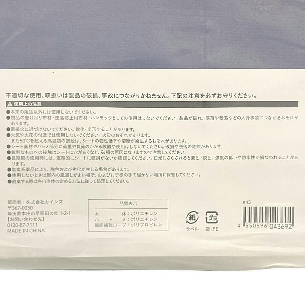 商品本体:ポリエチレン、ハトメ:ポリエチレン、ロープ:ポリプロピレン