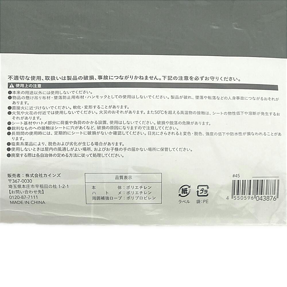 ●本来の用途以外に使用しないでください。●物品の懸け吊り布材や墜落防止用布材、あるいはハンモックとしての使用はしないでください。製品が破れ、墜落や転落などの人身事故につながる恐れがあります。