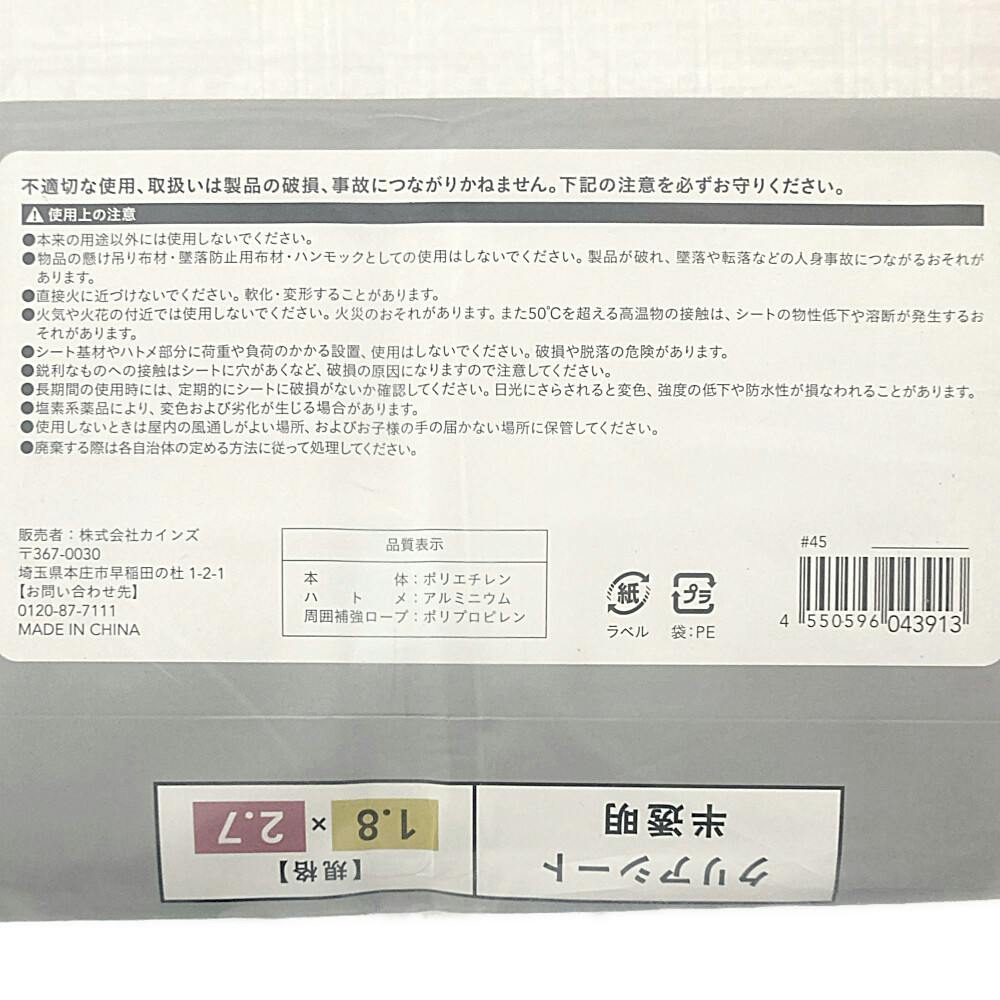 商品本体:ポリエチレン、ハトメ:アルミ、ロープ:ポリプロピレン