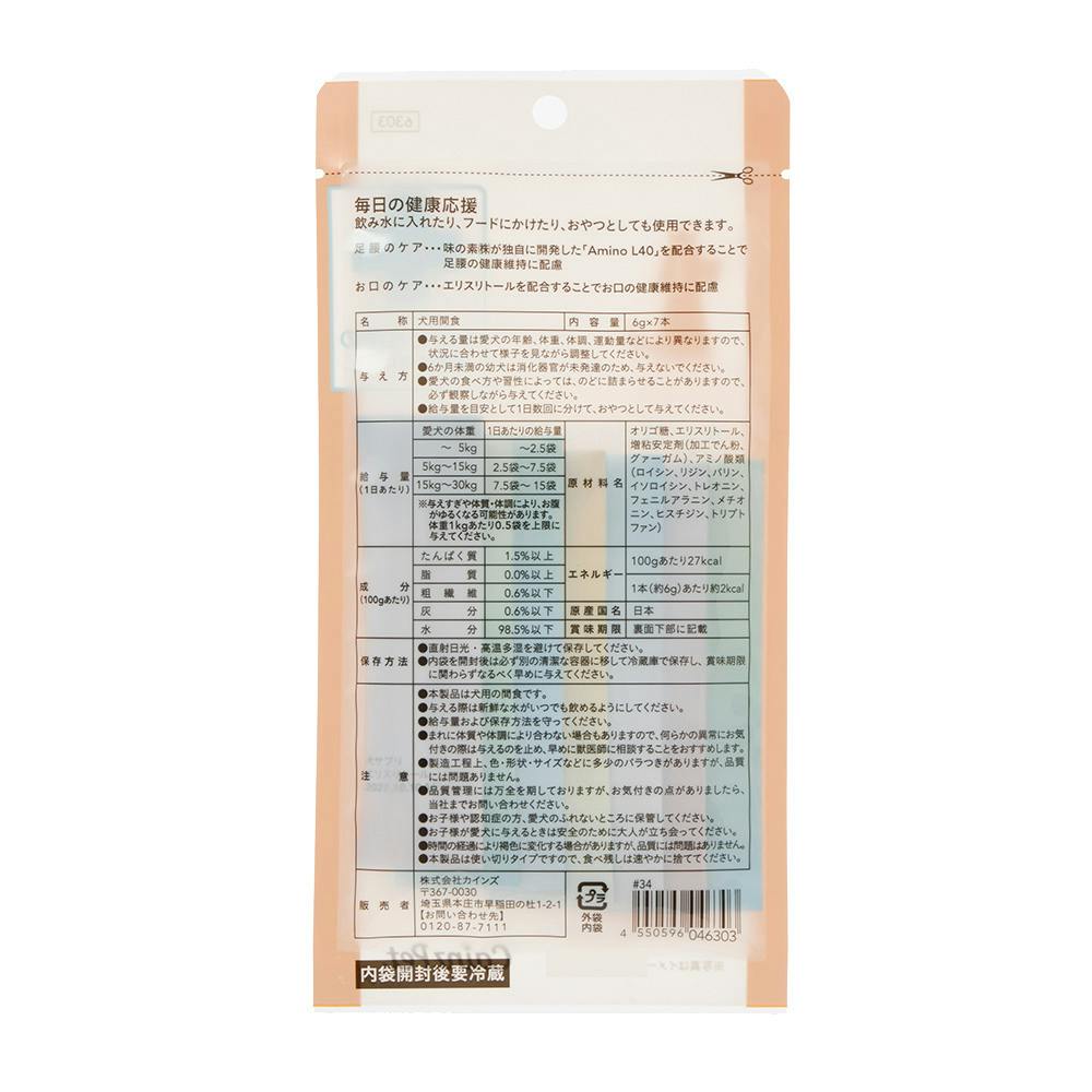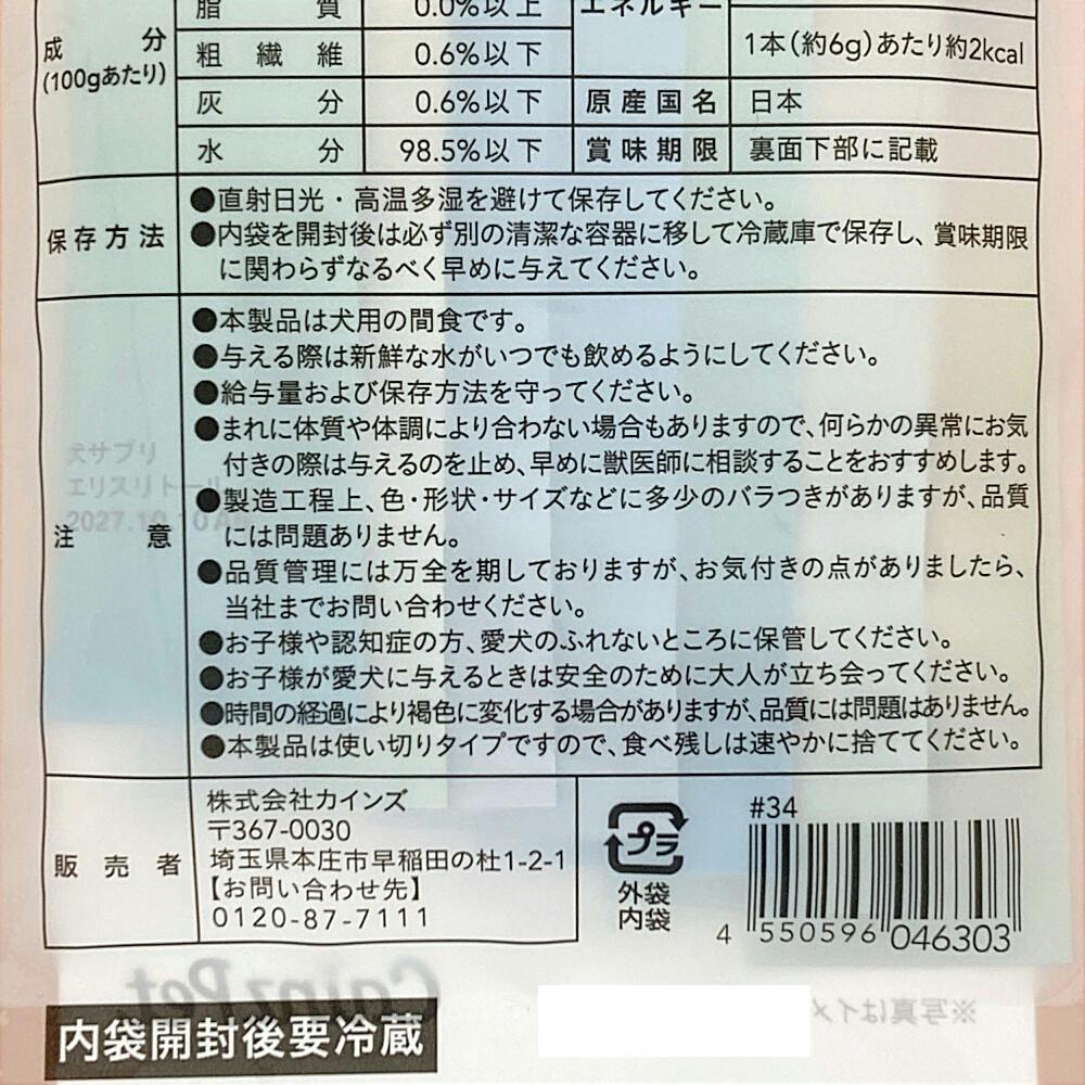 ペットの体質・体調によりおなかがゆるくなることがあります。異常にお気づきの際は、使用を控え獣医師にご相談ください。冷蔵庫での保管は避けてください。時間の経過とともに褐色に変化する場合がありますが、品質には問題はありません。