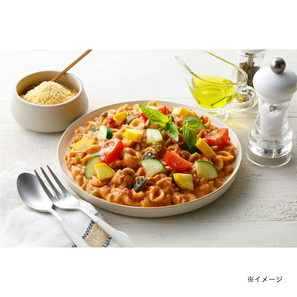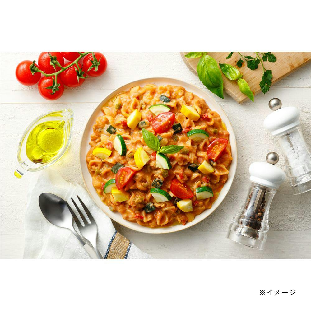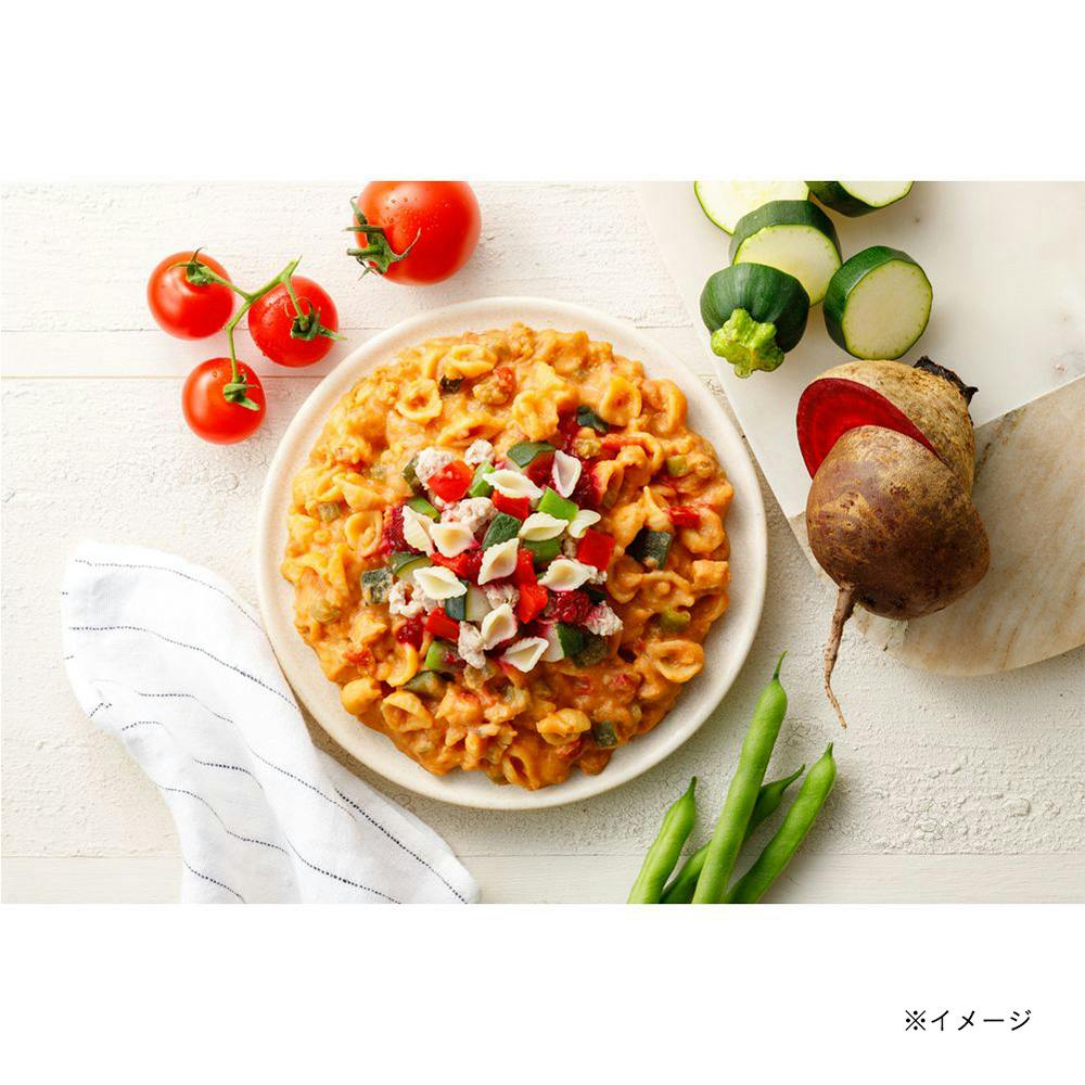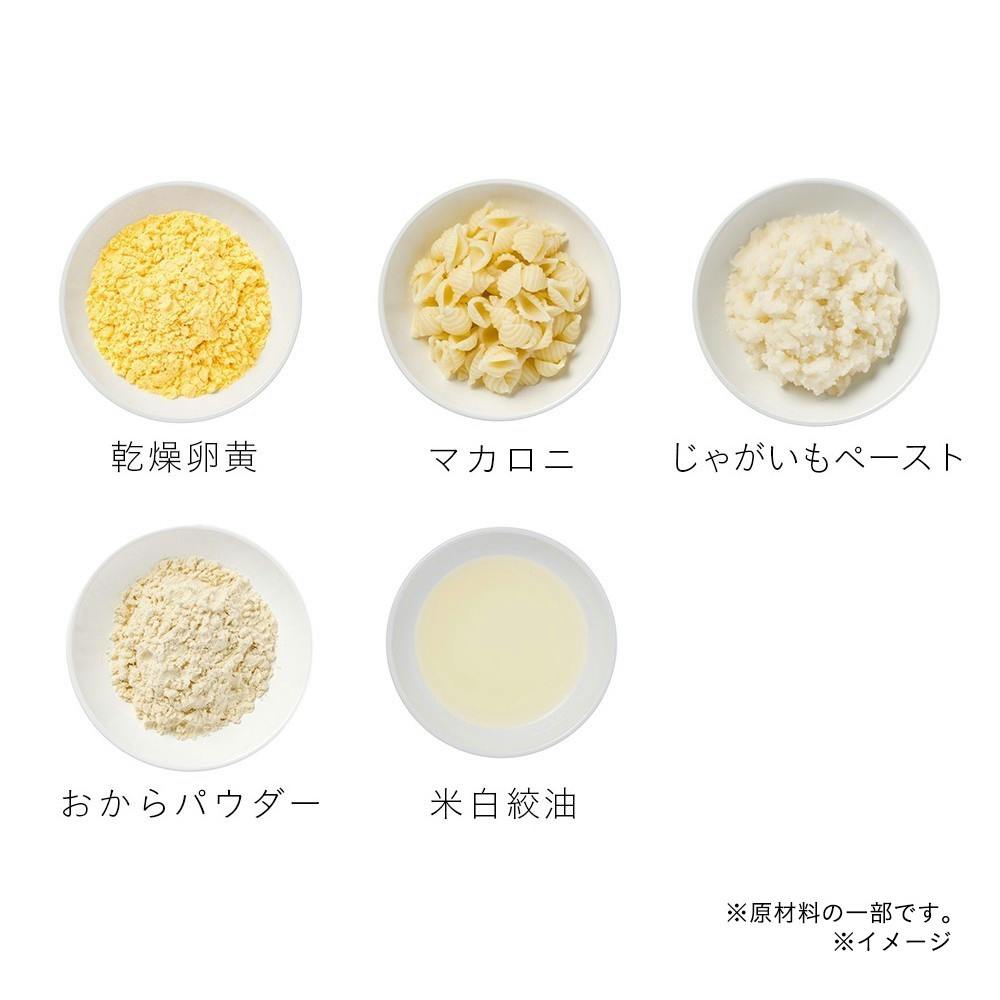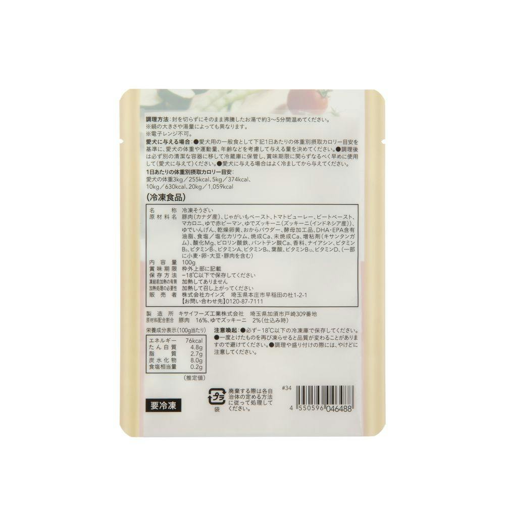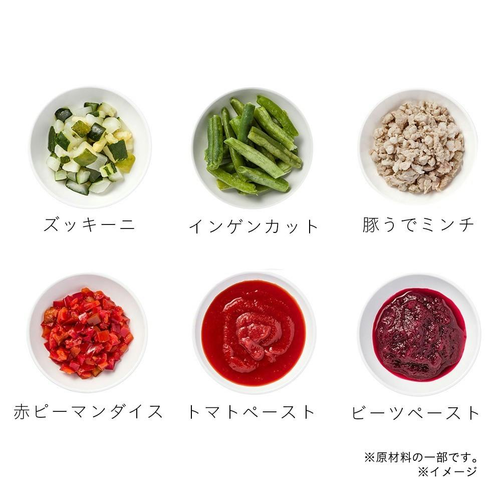 豚肉(カナダ産)、じゃがいもペースト(国内製造、遺伝子組換えでない)、トマトピューレー(国内製造)、ビートペースト、マカロニ、ゆで赤ピーマン、ゆでズッキーニ(インドネシア産)、ゆでいんげん、乾燥卵黄、おからパウダー、酵母加工品、DHA・EPA含有油脂、食塩