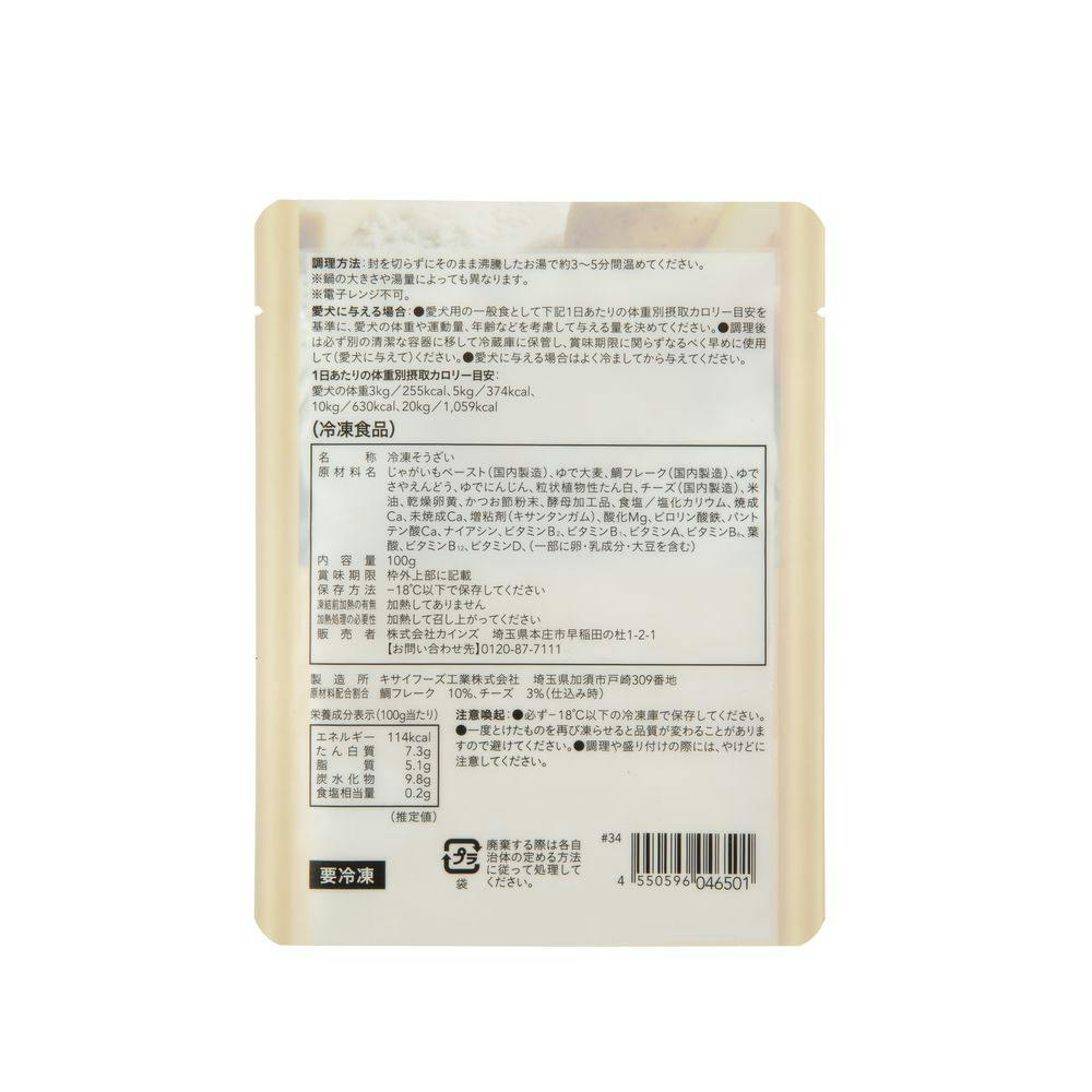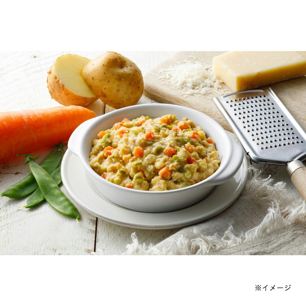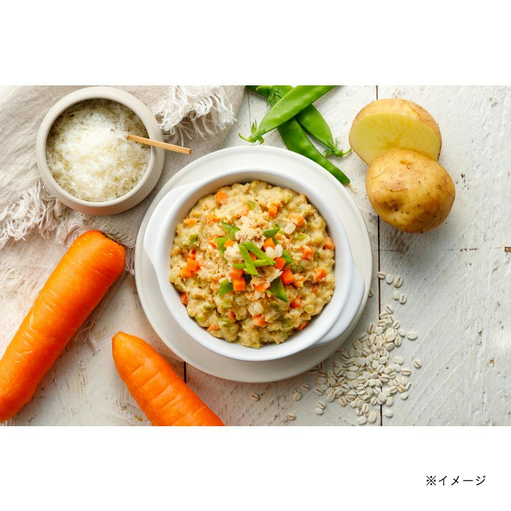 じゃがいもペースト(国内製造、遺伝子組換えでない)、ゆで大麦(イタリア産)、鯛フレーク(国内製造)、ゆでさやえんどう、ゆでにんじん、粒状植物性たん白、チーズ(国内製造)、米油、乾燥卵黄、かつお節粉末、酵母加工品、食塩/塩化カリウム、焼成Ca、未焼成Ca、