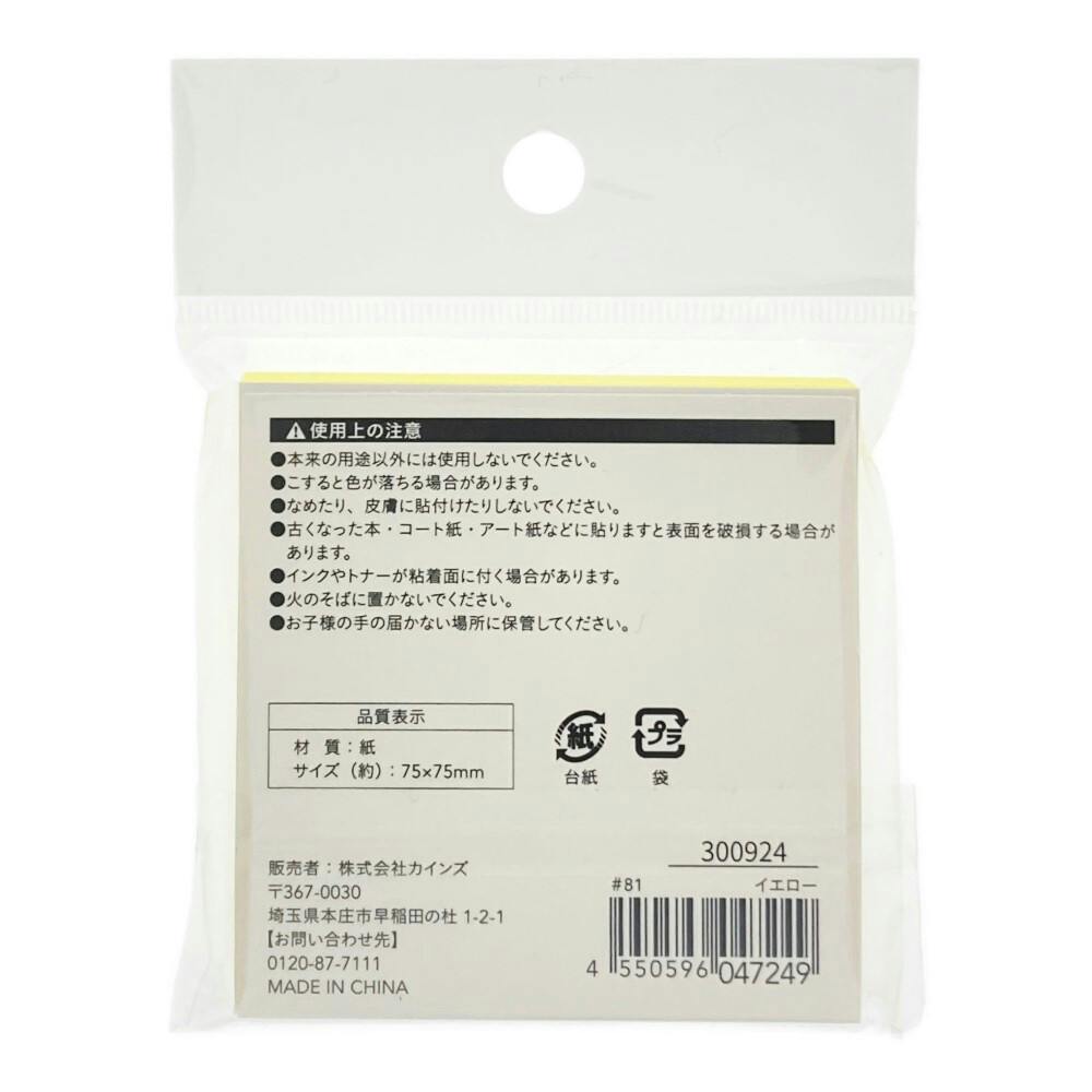 カインズ ふせん 75×75mm 100枚 イエロー