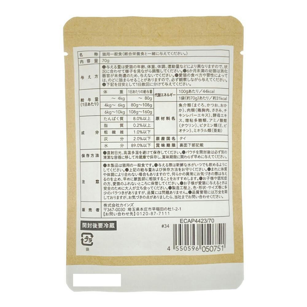 魚介類(まぐろ、かつお、おかか)、肉類(鶏胸肉、ささみ、チキンレバーエキス)、酵母エキス、増粘多糖類、アミノ酸類(タウリン)、ビタミン類(E、ビオチン)、ミネラル類(亜鉛)