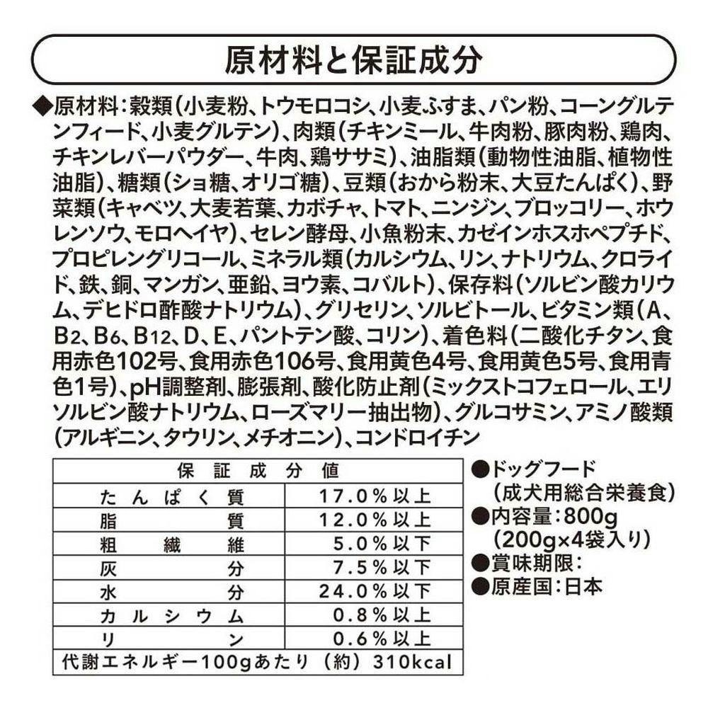 穀類(小麦粉、トウモロコシ、小麦ふすま、パン粉、コーングルテンフィード、小麦グルテン)、肉類(チキンミール、牛肉粉、豚肉粉、鶏肉、チキンレバーパウダー、鶏ササミ)、油脂類(動物性油脂、植物性油脂)、糖類(ショ糖、オリゴ糖)、豆類、他