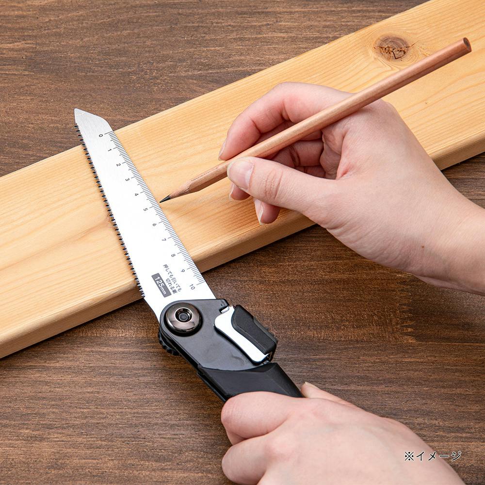 押しても引いてもきれるから狭い場所でも作業がしやすい。目盛り付きで簡易的な測定ができる。
