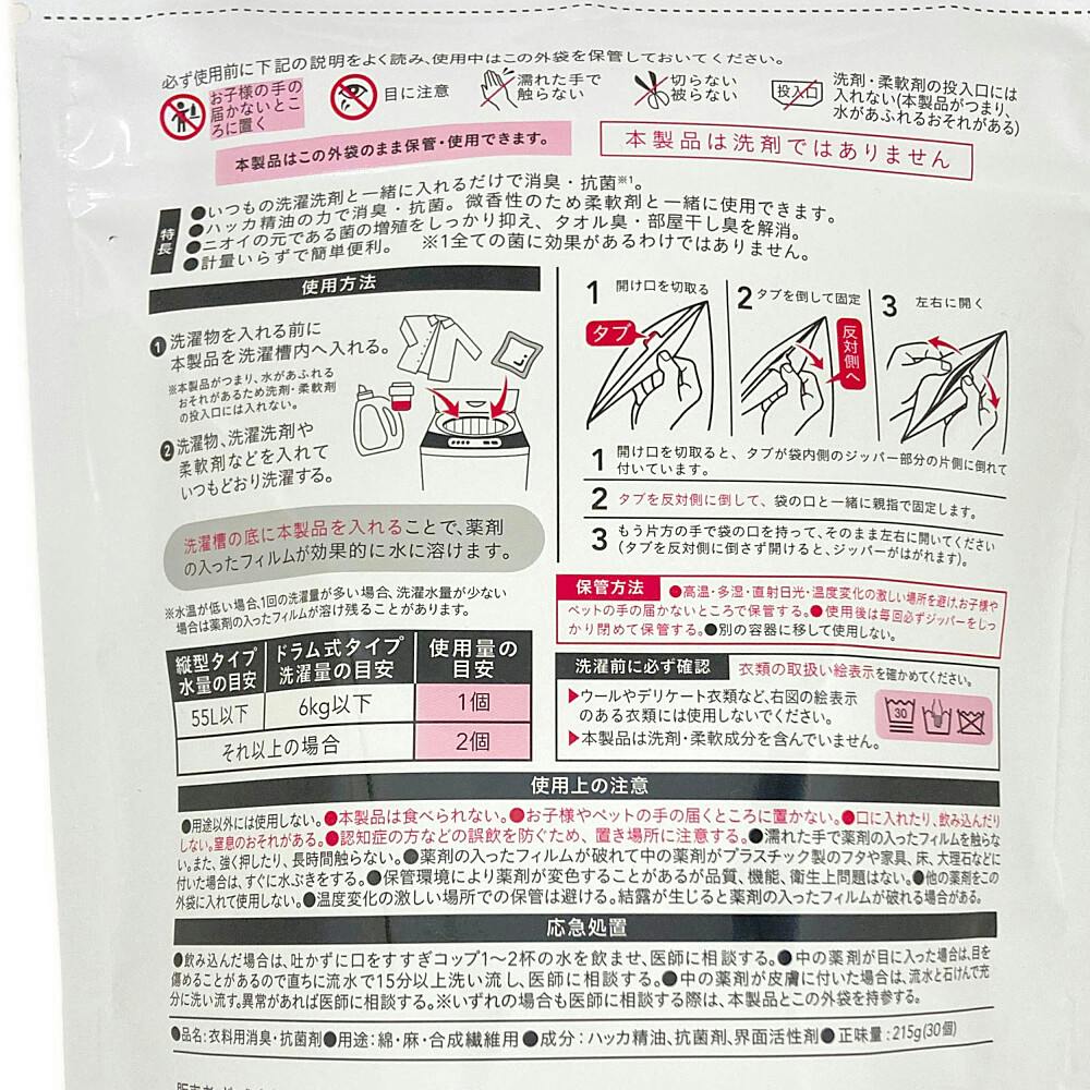 ●いつもの洗たく洗剤と一緒に入れるだけで消臭・抗菌(すべての菌を抗菌するわけではありません。)●ハッカ精油のチカラで消臭・抗菌!微香性のため柔軟剤と一緒にご使用いただけます。●ニオイの元である菌の増殖をしっかり抑え、タオル臭・部屋干し臭を解消!