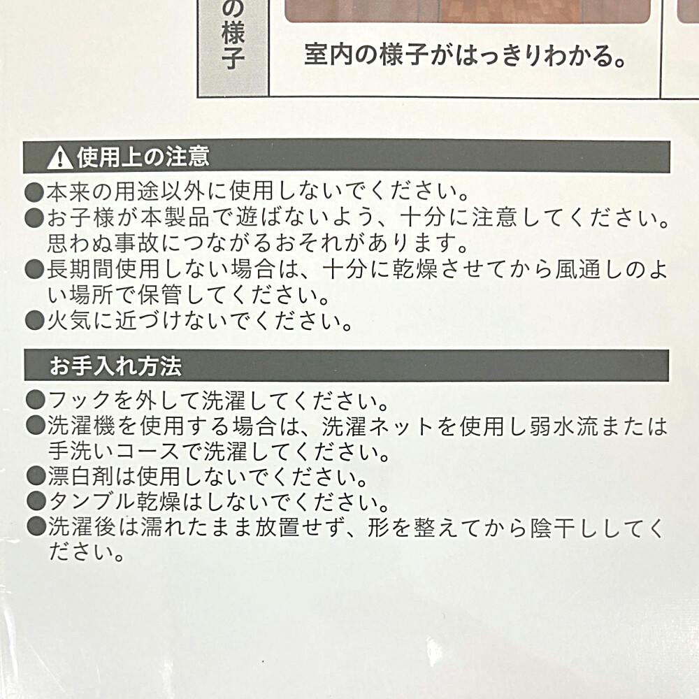 ◯:●フックを外して洗濯してください。●洗濯機を使用する場合は、洗濯ネットを使用し弱水流または手洗いコースで洗濯してください。●漂白剤は使用しないでください。●洗濯後は濡れたまま放置せず、形を整えてから陰干ししてください。