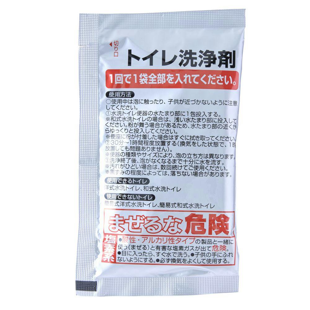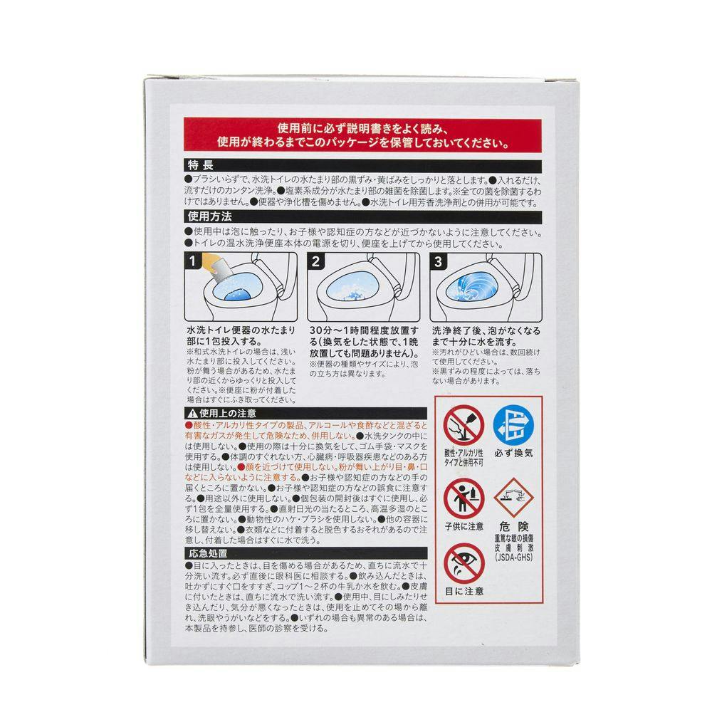 1.水洗便器の水たまり部に1包投入する。2.30分~1時間程度放置する(換気をした状態で、1晩放置しても問題ありません)。3.洗浄終了後、泡がなくなるまで十分に水を流す。