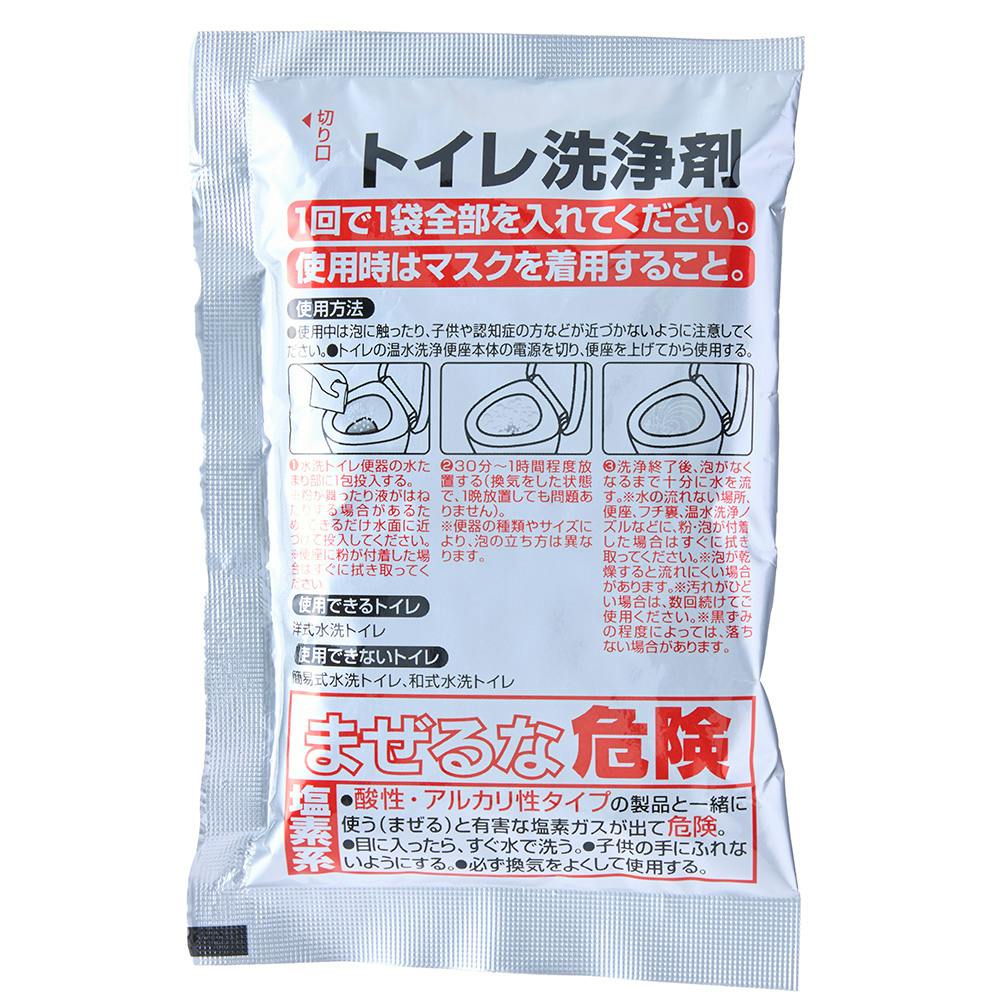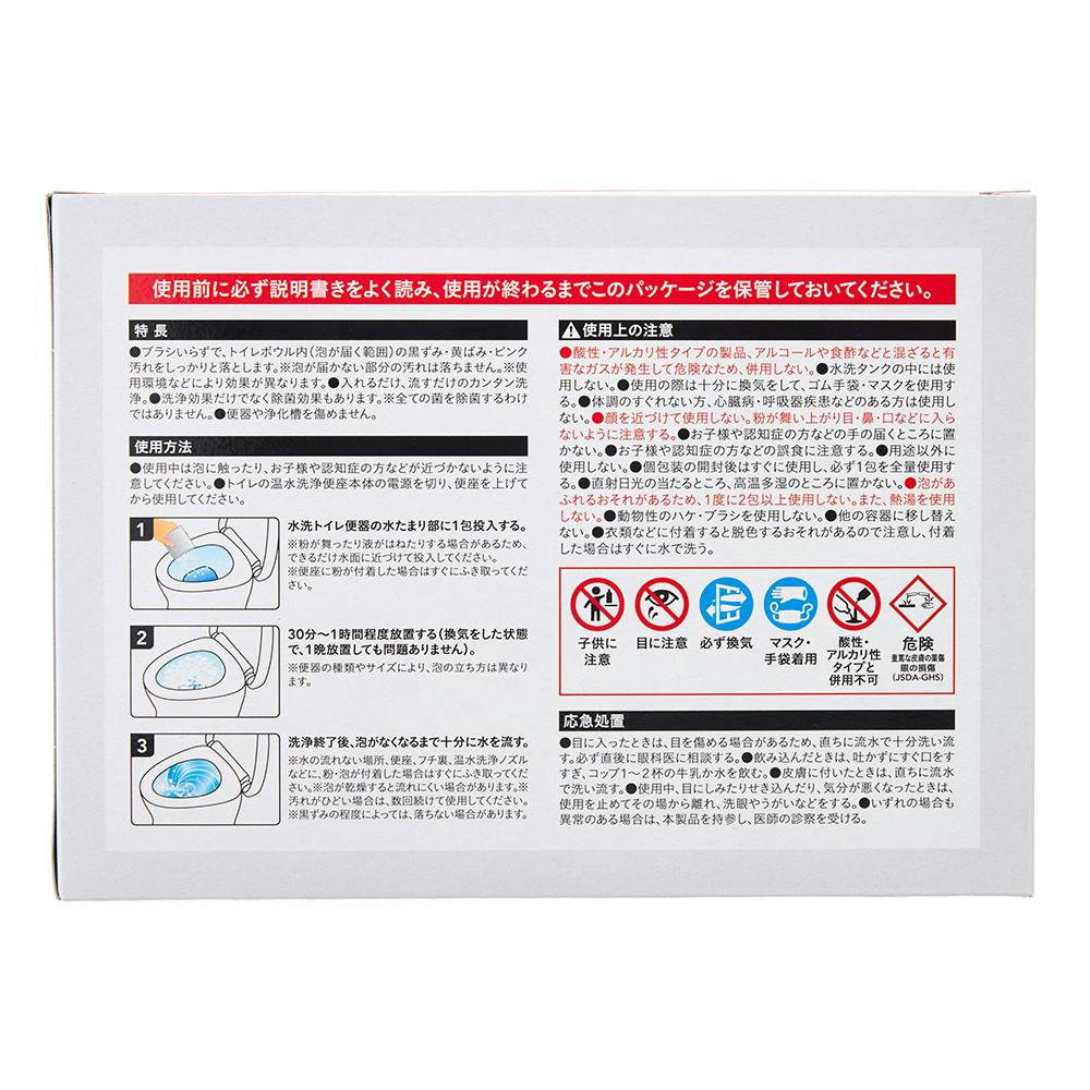 ①水洗トイレの水たまり部に1包投入する。②30分~1時間程度放置する(換気をした状態で1晩放置しても問題ありません)。③洗浄終了後、泡がなくなるまで十分に水を流す。