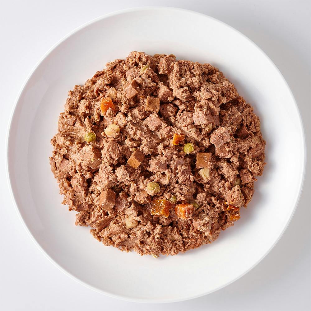 肉類(鶏肉、チキンエキス、牛肉)、小麦粉、野菜類(グリンピース、にんじん、じゃがいも)粉末セルロース、増粘多糖類、ミネラル類(Ca、P、K、Na、Cl、Fe、Mg、Zn、Se、Cu、Mn、I)、ビタミン類、着色料
