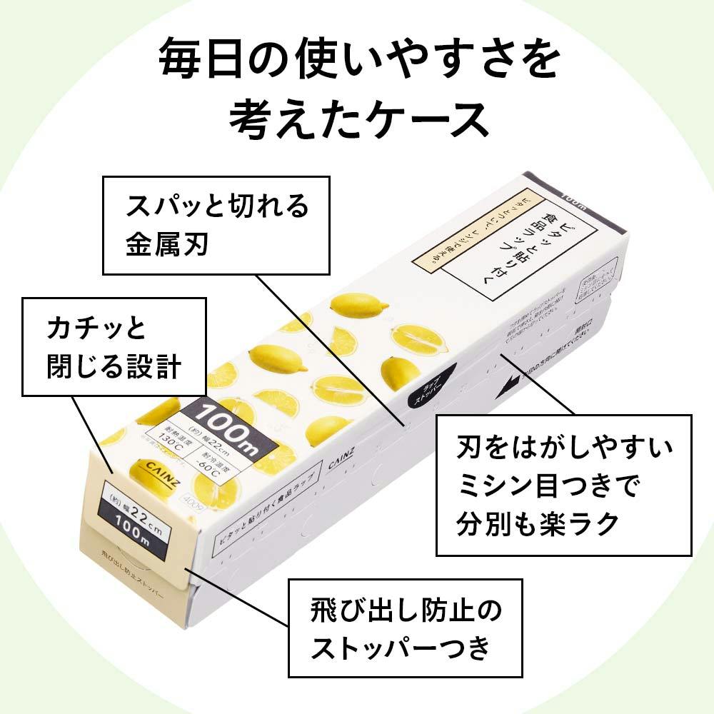 ●ピッと切れてピッタリ付く…よく伸びてピッタリはりつくので液体物でもこぼれにくい。●電子レンジの使用も安心…耐熱温度130°/耐熱温度‐60°で加熱・冷凍・冷蔵に対応。油分の多い食品を電子レンジにかけると高温になるので、直接ラップが触れないようにご注意ください。