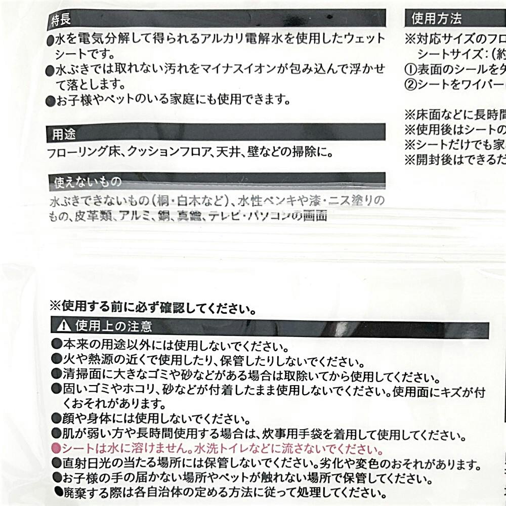 ●水を電気分解して得られるアルカリ電解水を使用したウェットシートです。●水拭きでは取れない汚れをマイナスイオンが包み込んで浮かせて落とします。●お子様やペットのいるご家庭にも安心してお使いいただけます。
