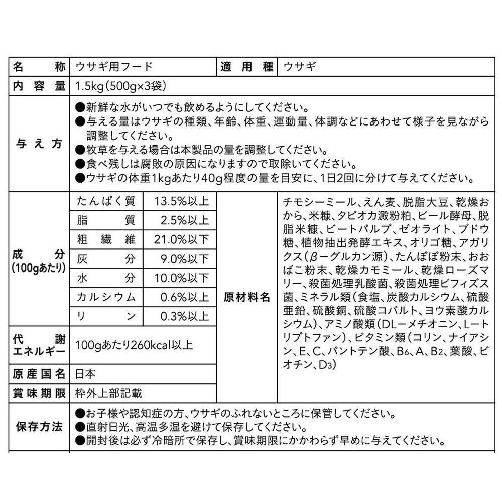 チモシーミール、えん麦、脱脂大豆、乾燥おから、米糠、タピオカ澱粉粕、ビール酵母、脱脂米糠、ビートパルプ、ゼオライト、ブドウ糖、植物抽出発酵エキス、オリゴ糖、アガリクス(βーグルカン源、たんぽぽ粉末、おおばこ粉末、乾燥カモミール、乾燥ローズマリー