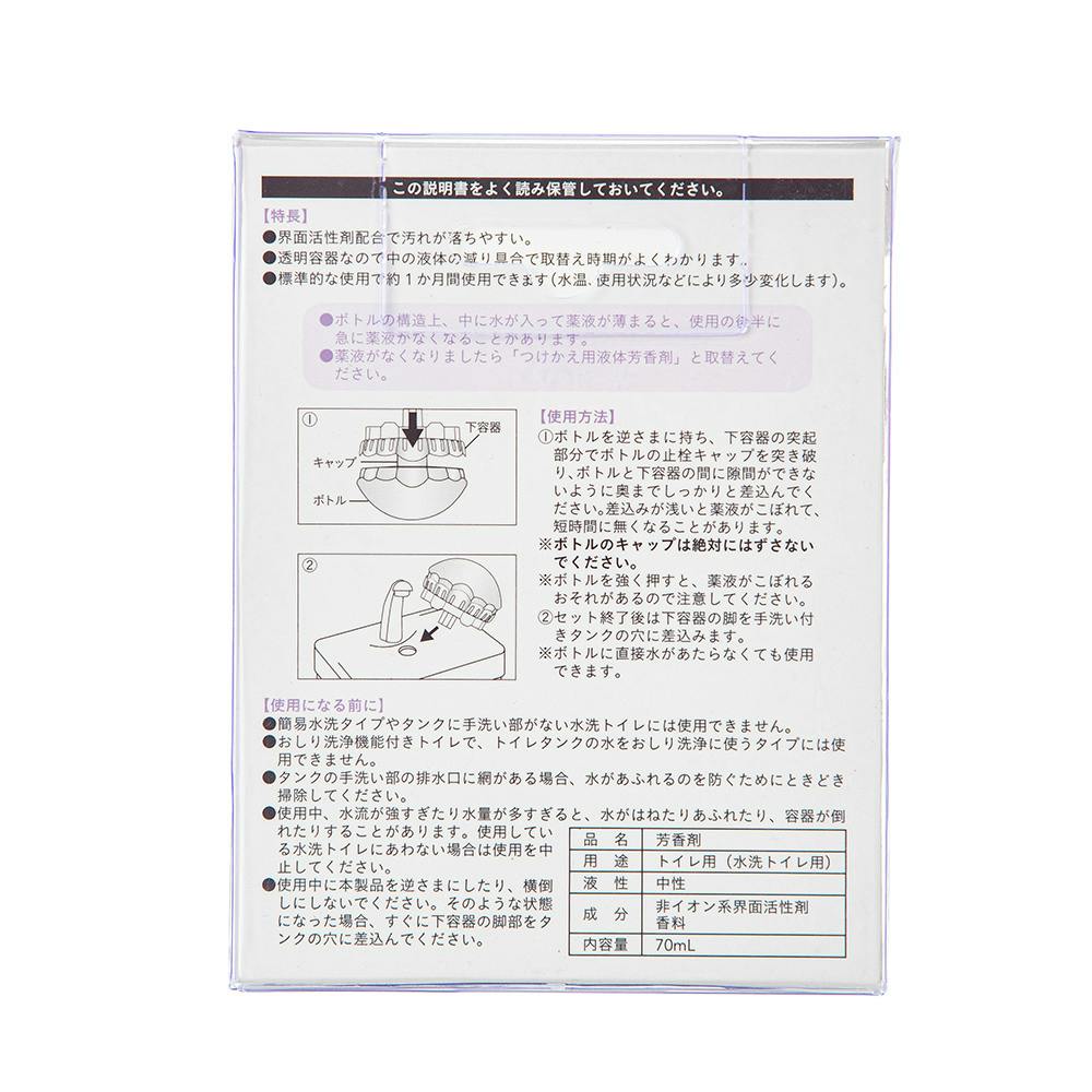 ●ボトルの構造上、中に水が入って薬液が薄まると、ご使用の後半に急に薬液がなくなることがあります。●薬液が無くなりましたら「つけかえ用液体芳香剤」とお取り替えください。
