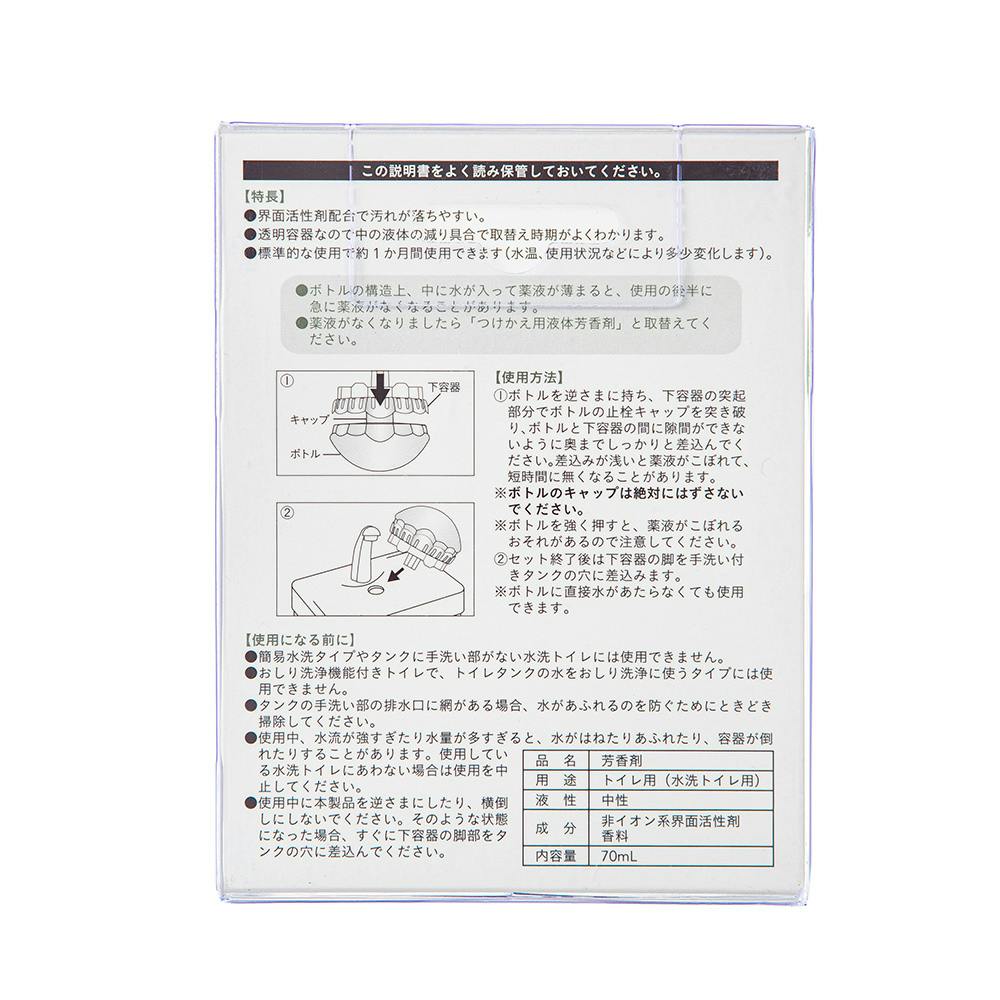 ●ボトルの構造上、中に水が入って薬液が薄まると、ご使用の後半に急に薬液がなくなることがあります。●薬液が無くなりましたら「つけかえ用液体芳香剤」とお取り替えください。