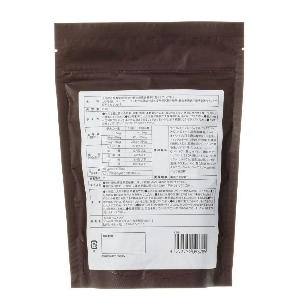 牛生肉、ビーフミール、玄米、ジャスミン米、大豆、大豆ミール、油脂類(鶏脂、サーモンオイル、大豆油)、フィッシュミール、フラクトオリゴ糖、野菜類(乾燥にんじん、乾燥かぼちゃ)、イチョウ葉粉末、ユッカ抽出物、ビタミン類、ミネラル類、酸化防止剤