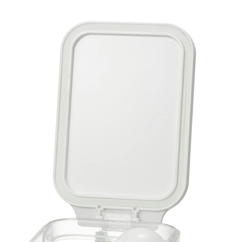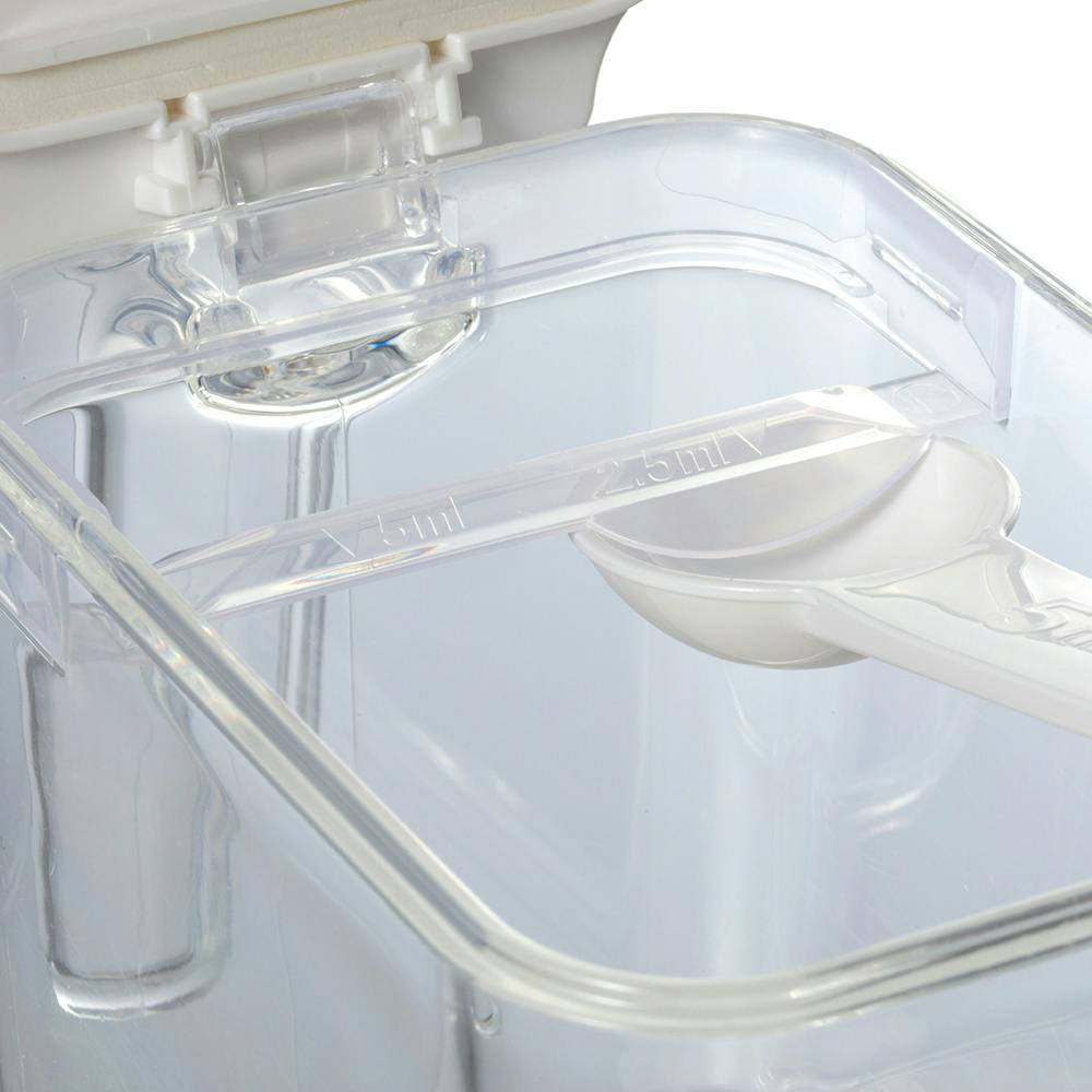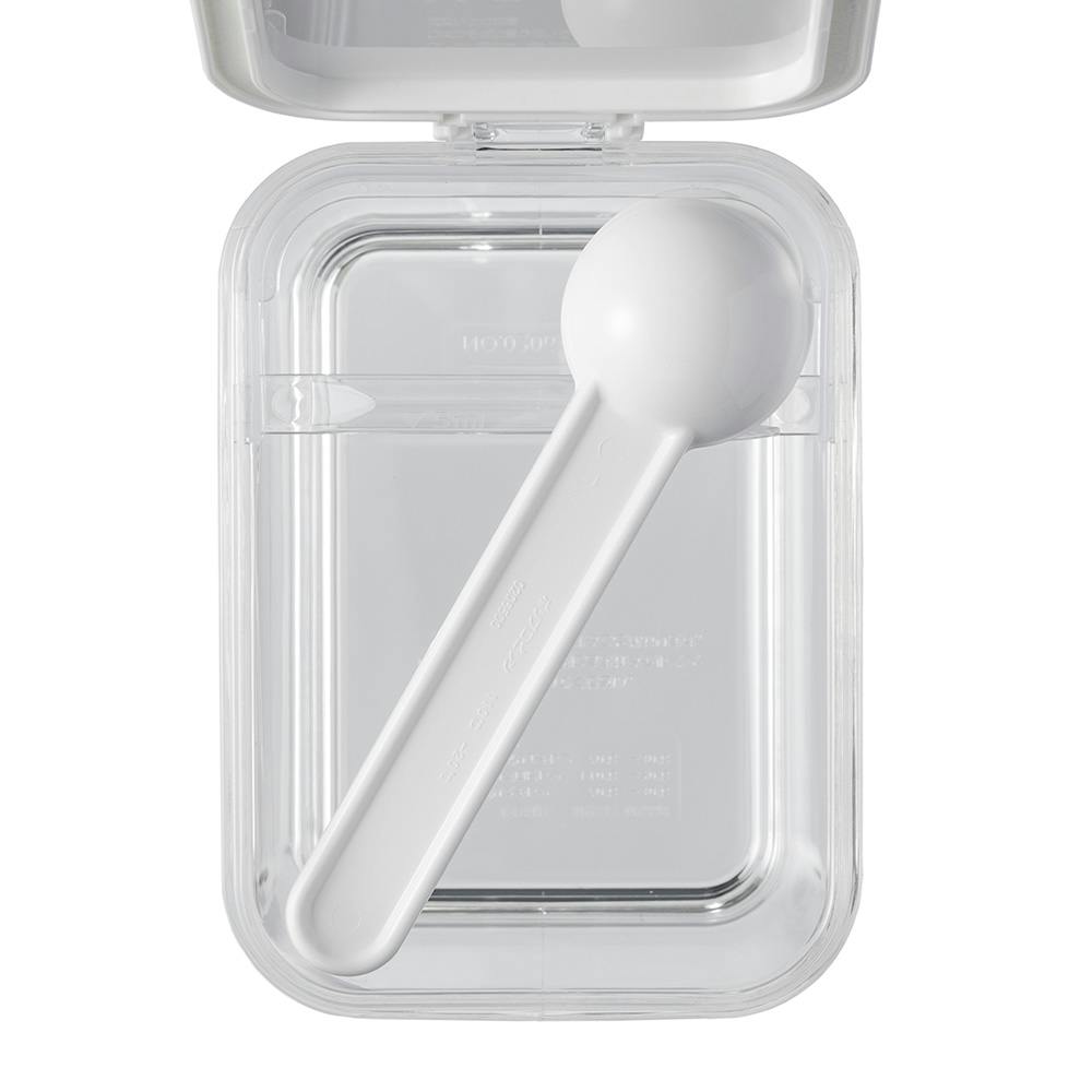 本体・フタ=PS、すり切り板=PP、パッキン=発泡PE、スプーン=PP