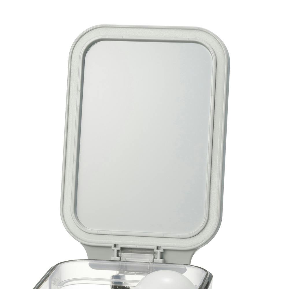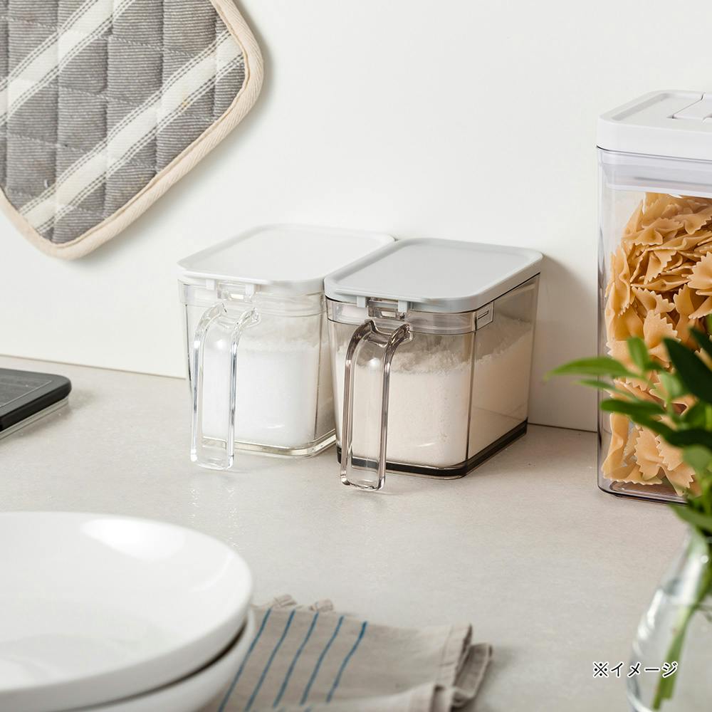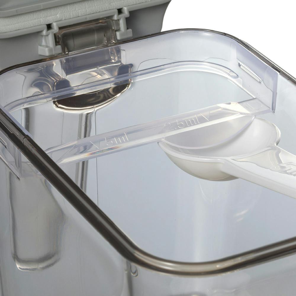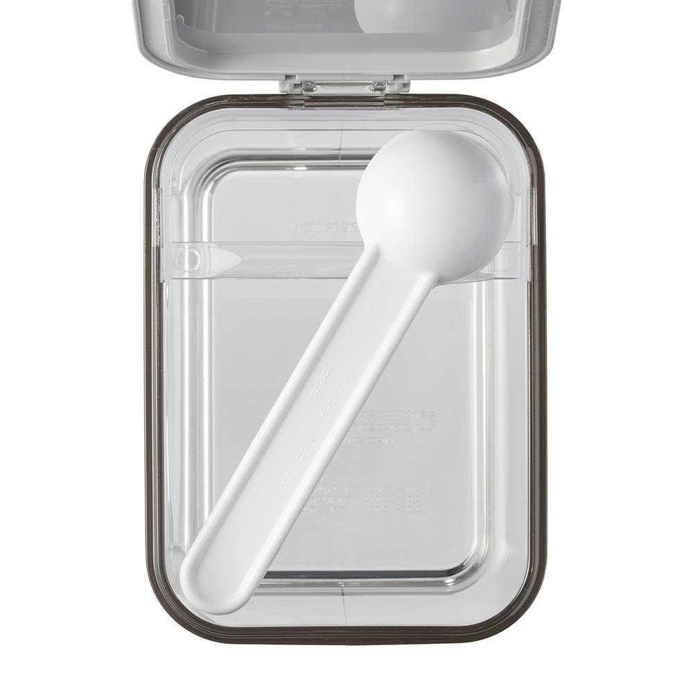 本体・フタ=PS、すり切り板=PP、パッキン=発泡PE、スプーン=PP