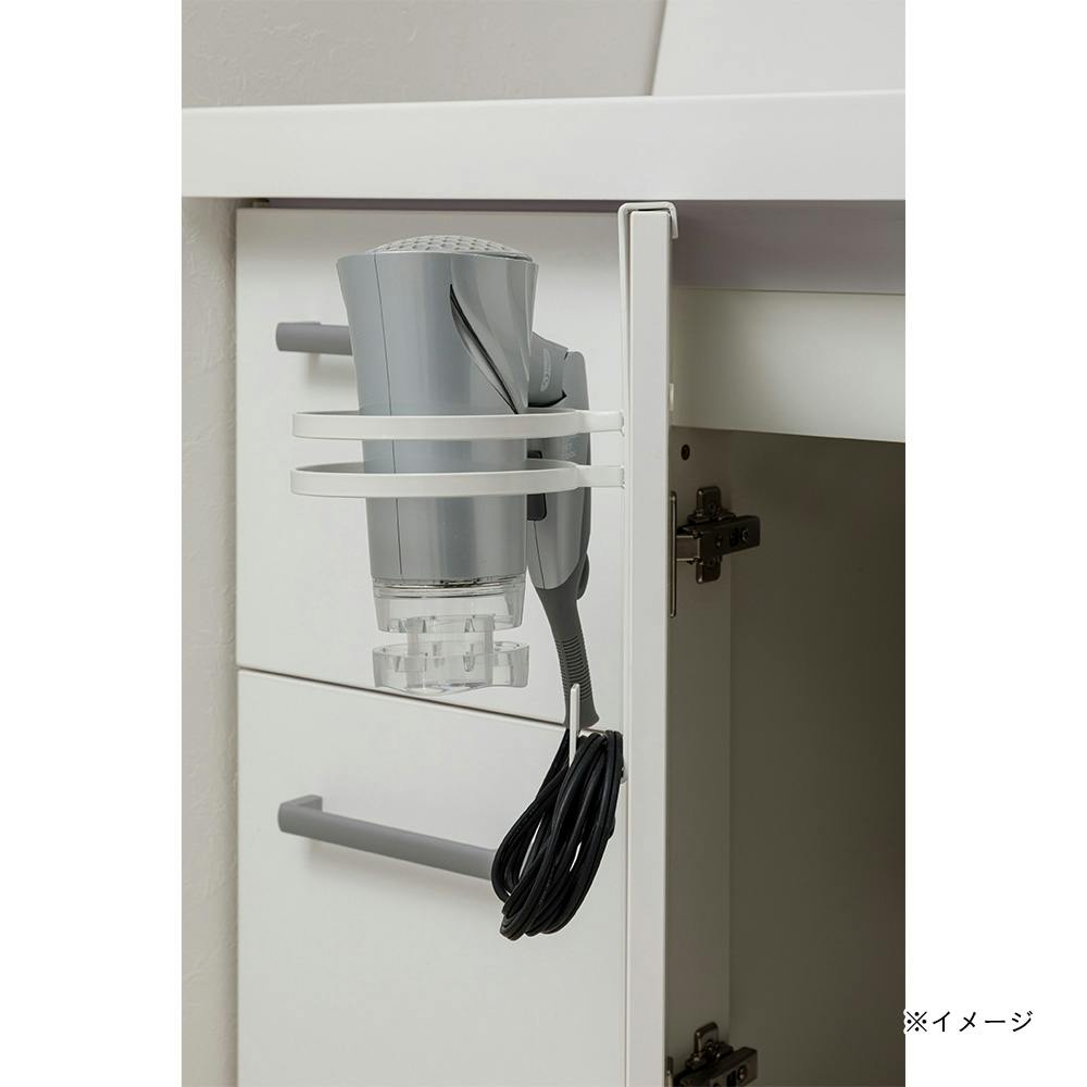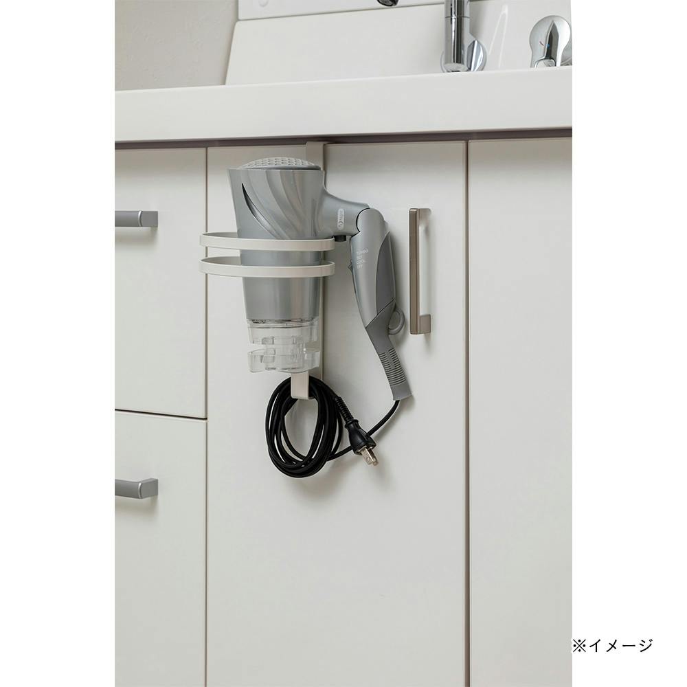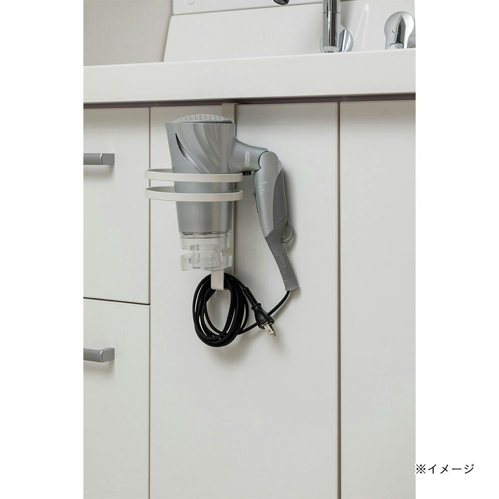 洗面台の扉などに引っ掛かけてドライヤーが収納できる。
