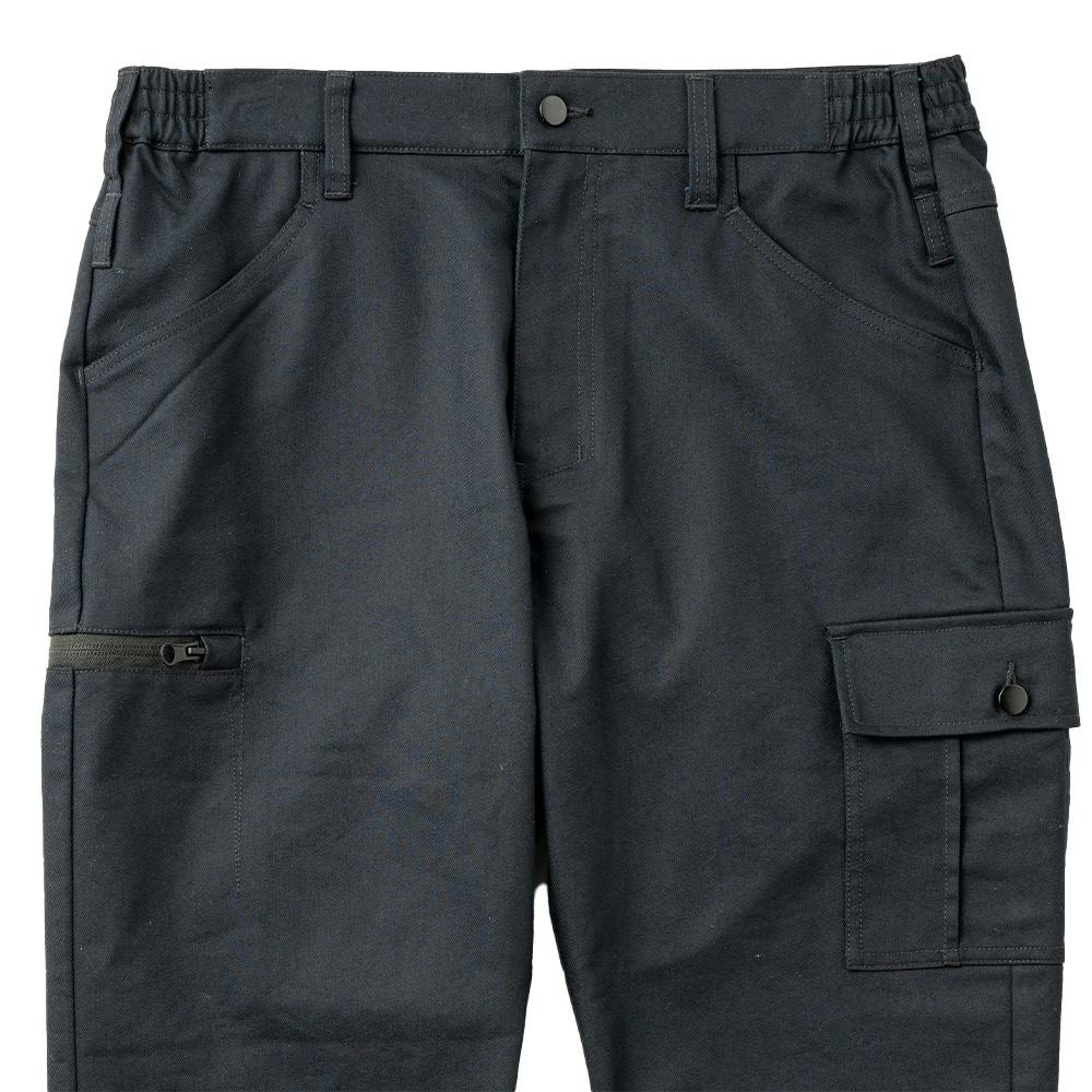 ●丈夫な綿混素材 ●サイドポケット付き ●ダブルループ ●ウエスト脇ゴム ●ファスナーポケット ●フラップポケット