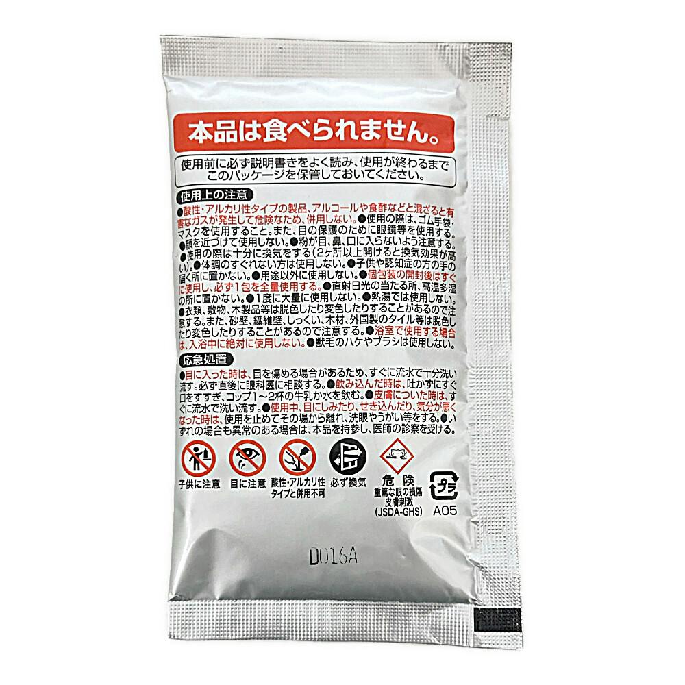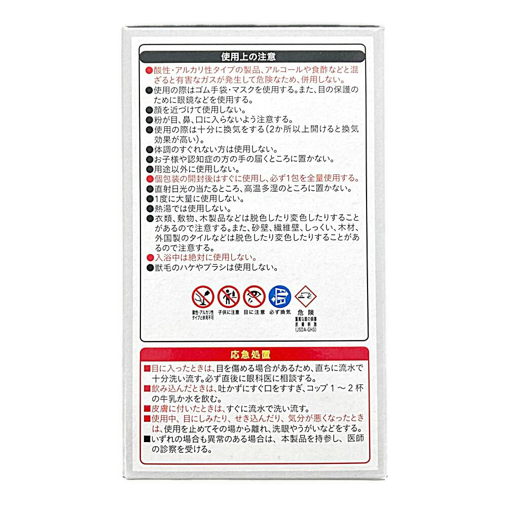 ●酸性・アルカリ性タイプの製品、アルコールや食酢などと混ざると有害なガスが発生して危険なため、併用しない。●個包装の開封後はすぐに使用し、必ず1包を全量使用する。●入浴中は絶対に使用しない。