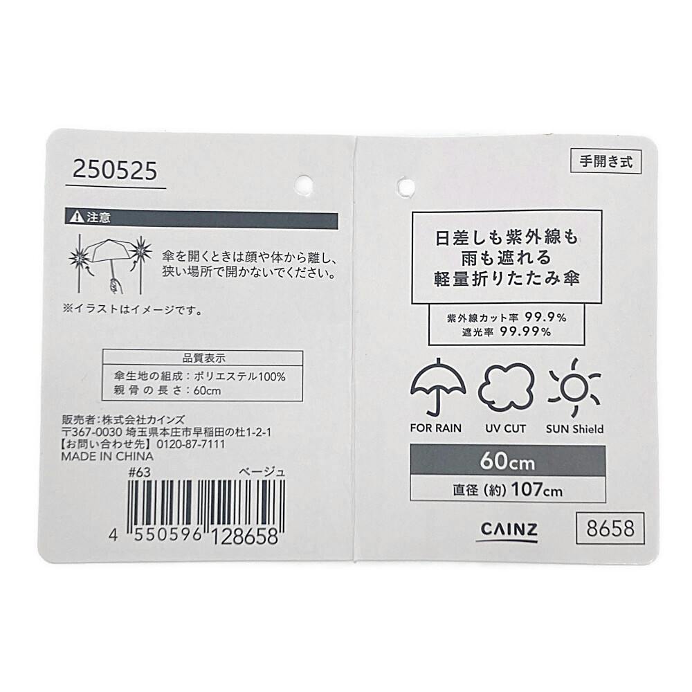 日差しも紫外線も雨も遮れる軽量折傘 60cm ベージュ