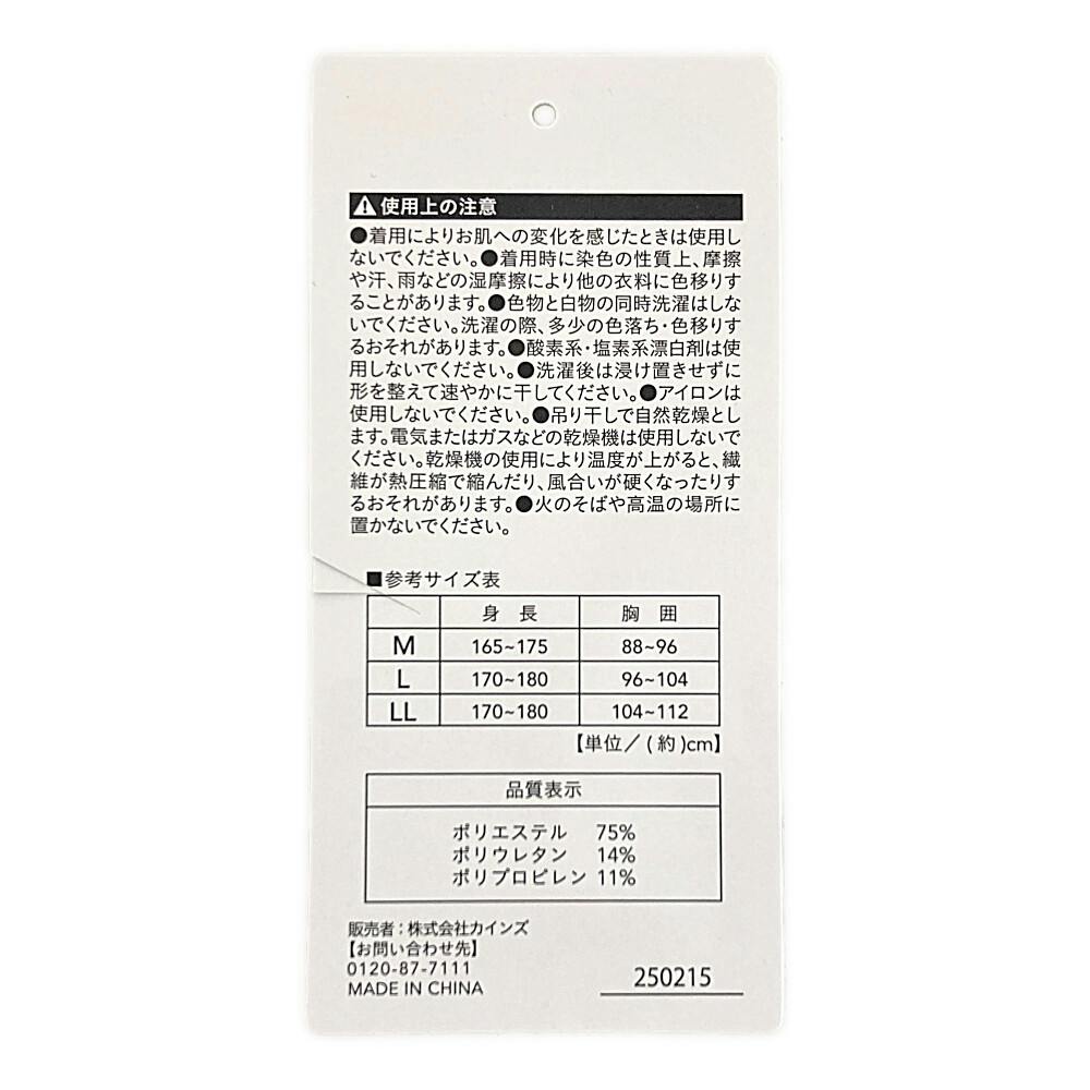 ポリエステル:75%、ポリウレタン:14%、ポリプロピレン:11%