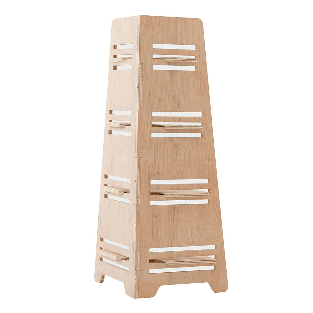 ご自宅や庭の角のスペースにぴったり収まるラックです。各段にある特徴的な3つの穴の好きな場所に棚を差し込んでご利用ください。あえて棚を設置せず2段分のスペースでレイアウトしていただくことも可能です。Mサイズは高さ120cmで4段の仕様です。