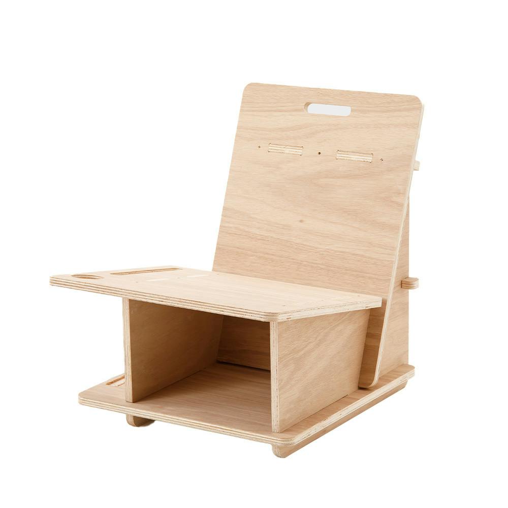 背面と右側面に本が収納できる座椅子です。教会の礼拝堂で使用されていた椅子をモチーフとしています。ドリンクホルダーも付いています。座面に「フロアクッションflattyミニ(別売)」がぴったり収まります。