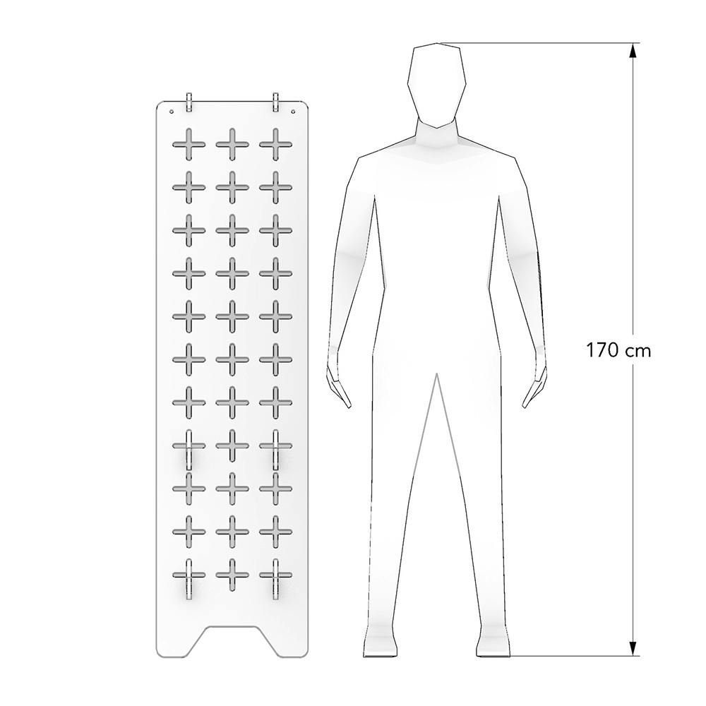 高さが160cmの木製のA看板です。片面には印象的な十字穴があしらわれており、もう片面はフラットです。A2のポスター2枚分のサイズです。上部のパーツでも固定いただけますが、板の上部左右に穴が空いており紐(別売)で固定することも可能です