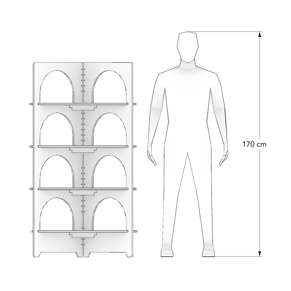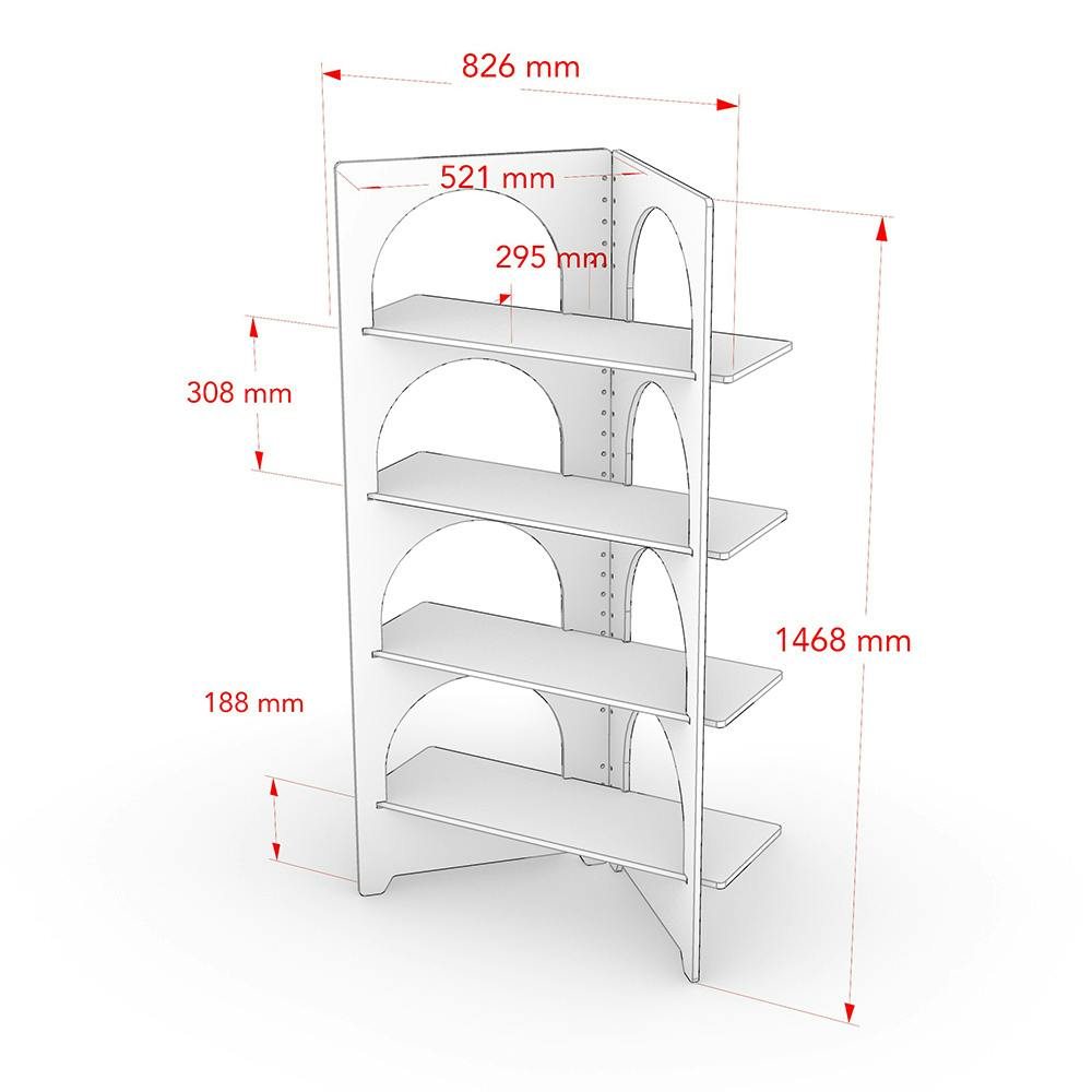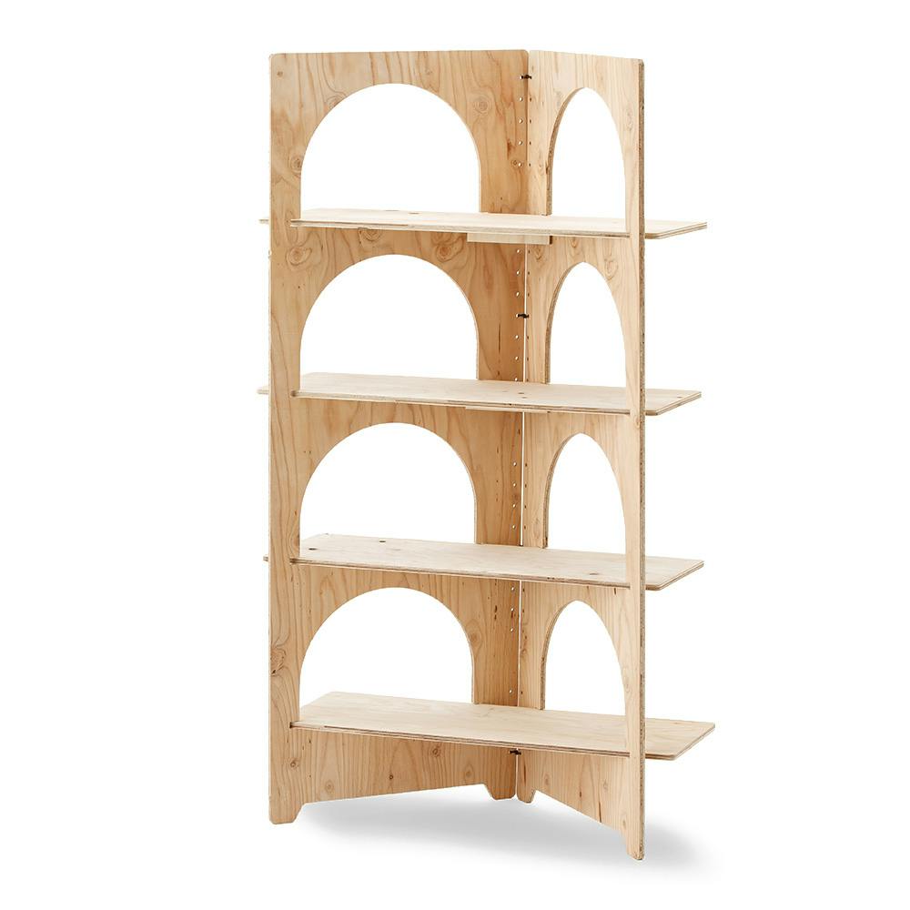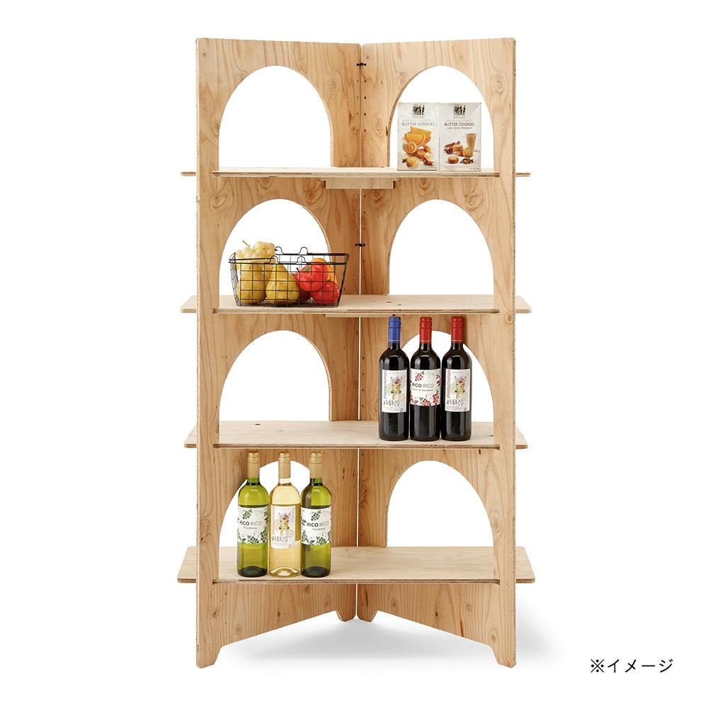 折りたたみできる4段の木製ディスプレイです。梁パーツにて固定し、棚板を差し込むだけで簡単に組み立てられます。付属の結束バンドでも固定いただけますし、穴に紐(別売)を使用していただくことも可能です。
