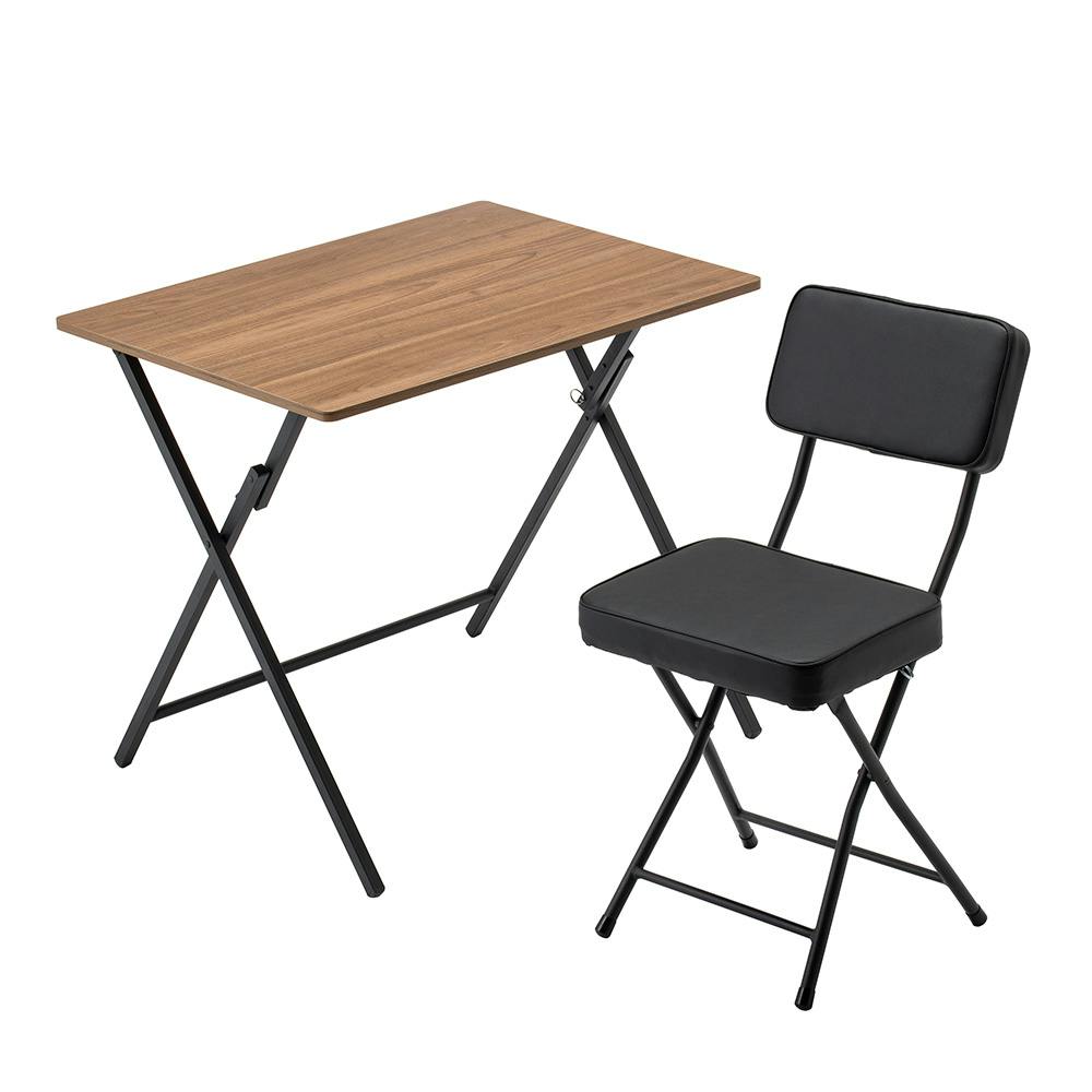 ●組立不要で広げるだけですぐに使える。●使わない時は折りたたんで収納できる。●天板はキズが付きにくいメラミン素材 ●テーブルもチェアもロック機能でしっかり固定できる。●チェアの座面が幅広でりラックスして座れる。