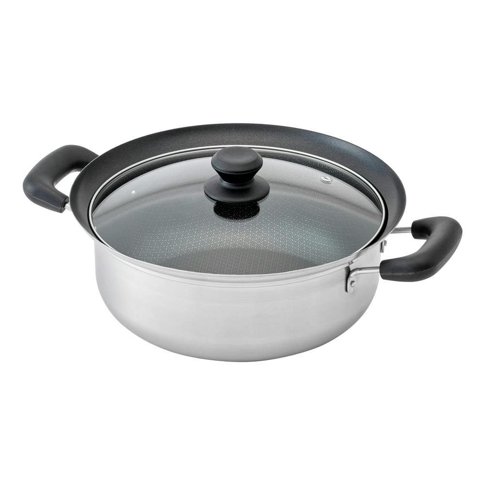 内面/ふっ素樹脂塗膜加工 本体/ステンレス鋼 二層底/アルミニウム合金 取っ手/フェノール樹脂