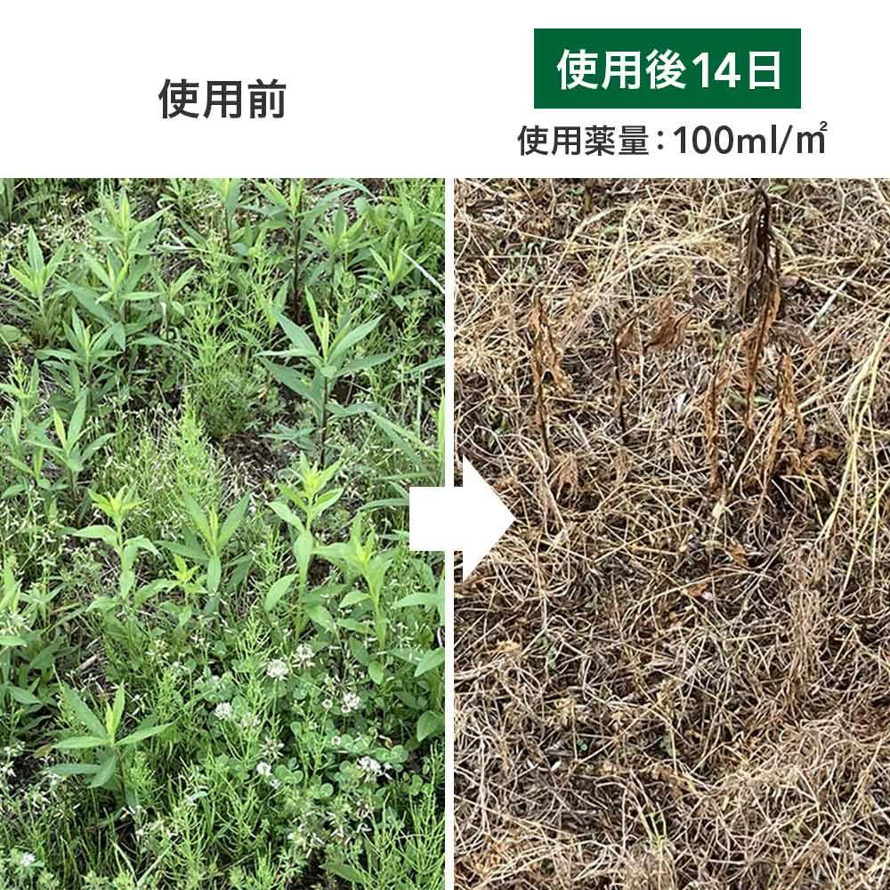 葉から吸収して根まで枯らします。土にそのままかかるとアミノ酸として分解されるので土にもひとにもやさしい除草剤です