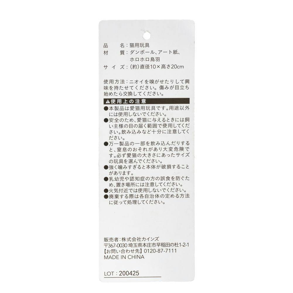 ●本製品は愛猫用玩具です。用途以外 には使用しないでください。 ●安全のため、愛猫に与えるときには飼 い主様の目の届く範囲で使用してくだ さい。飲み込みなど十分に注意してく ださい。