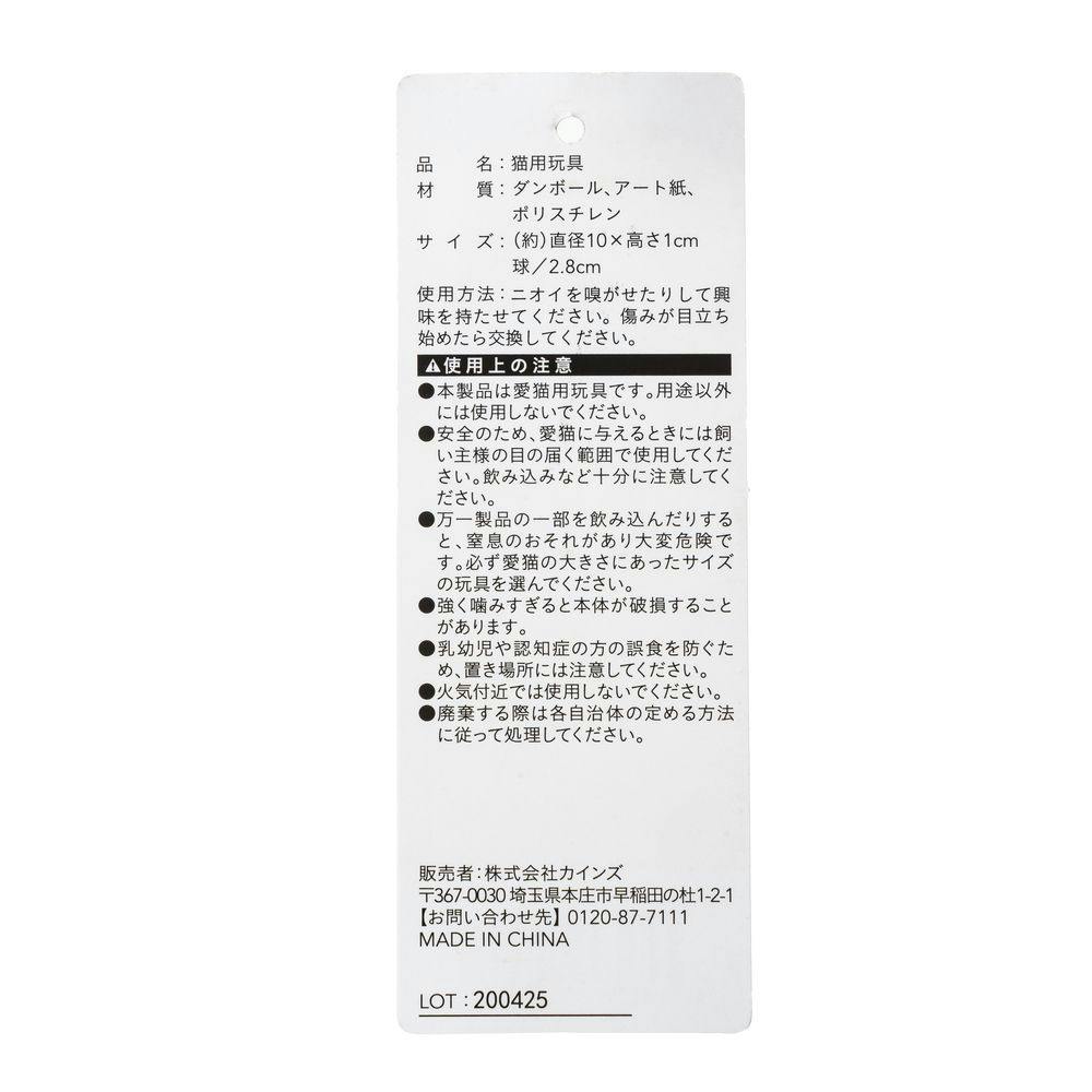 ●本製品は愛猫用玩具です。用途以外 には使用しないでください。 ●安全のため、愛猫に与えるときには飼 い主様の目の届く範囲で使用してくだ さい。飲み込みなど十分に注意してく ださい。