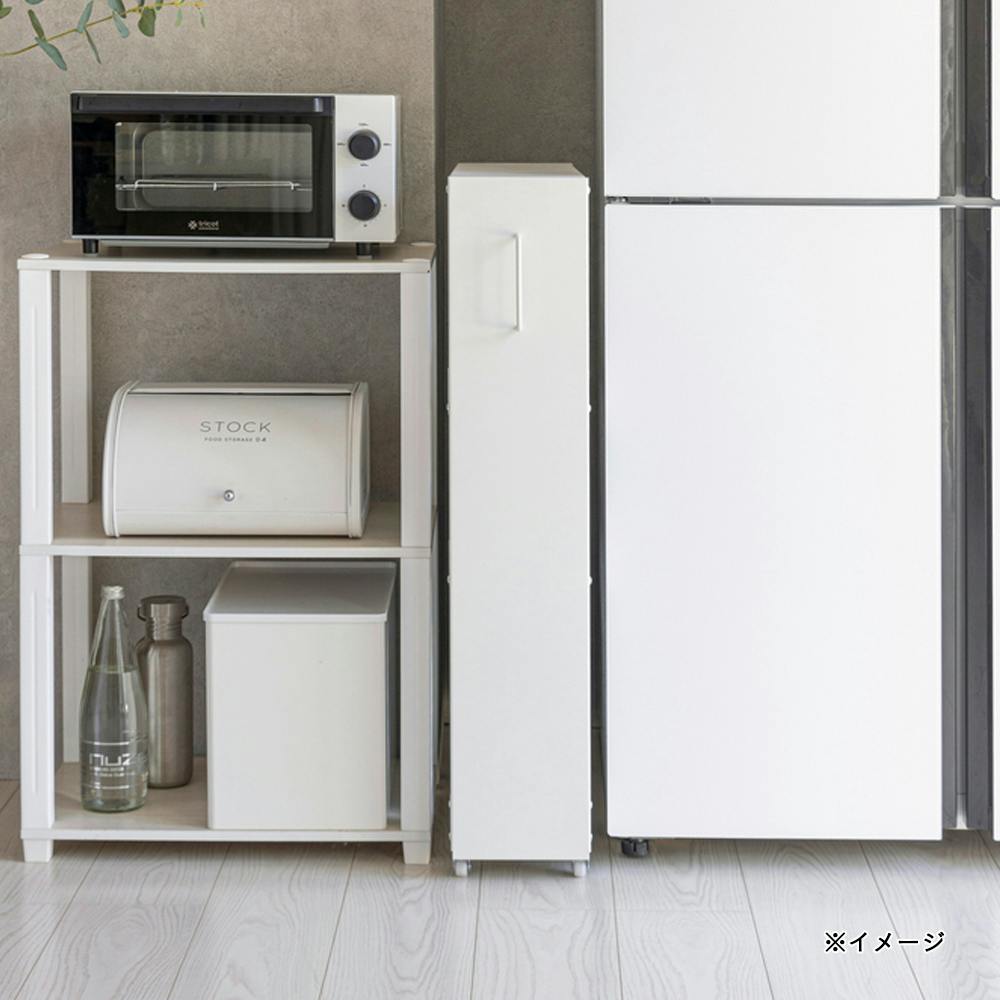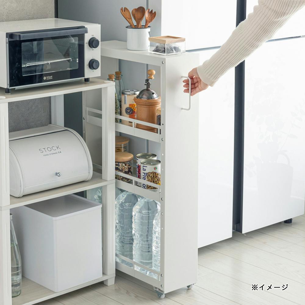 ●キッチンのすき間に収まる。●キャスター付きで引出ししやすい。●別売りの整理収納小物ケースSkittoを使えば棚板を仕切ることができる。