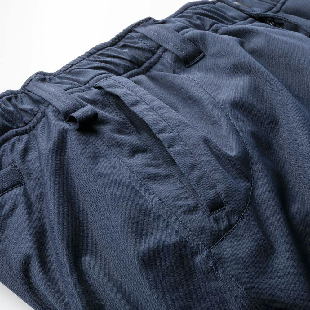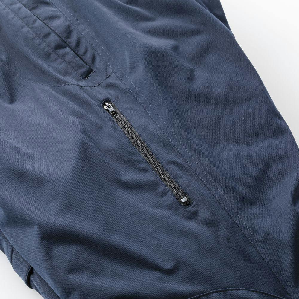 防風、保温(防寒)、ストレッチ、ウエストゴム仕様、 股ぐりマチ付き、膝ダーツ付き、6つのポケット付き