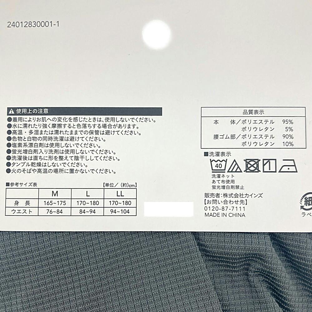 ●本体/ポリエステル95%、ポリウレタン5% ●腰ゴム部/ポリエステル90%、ポリウレタン10%