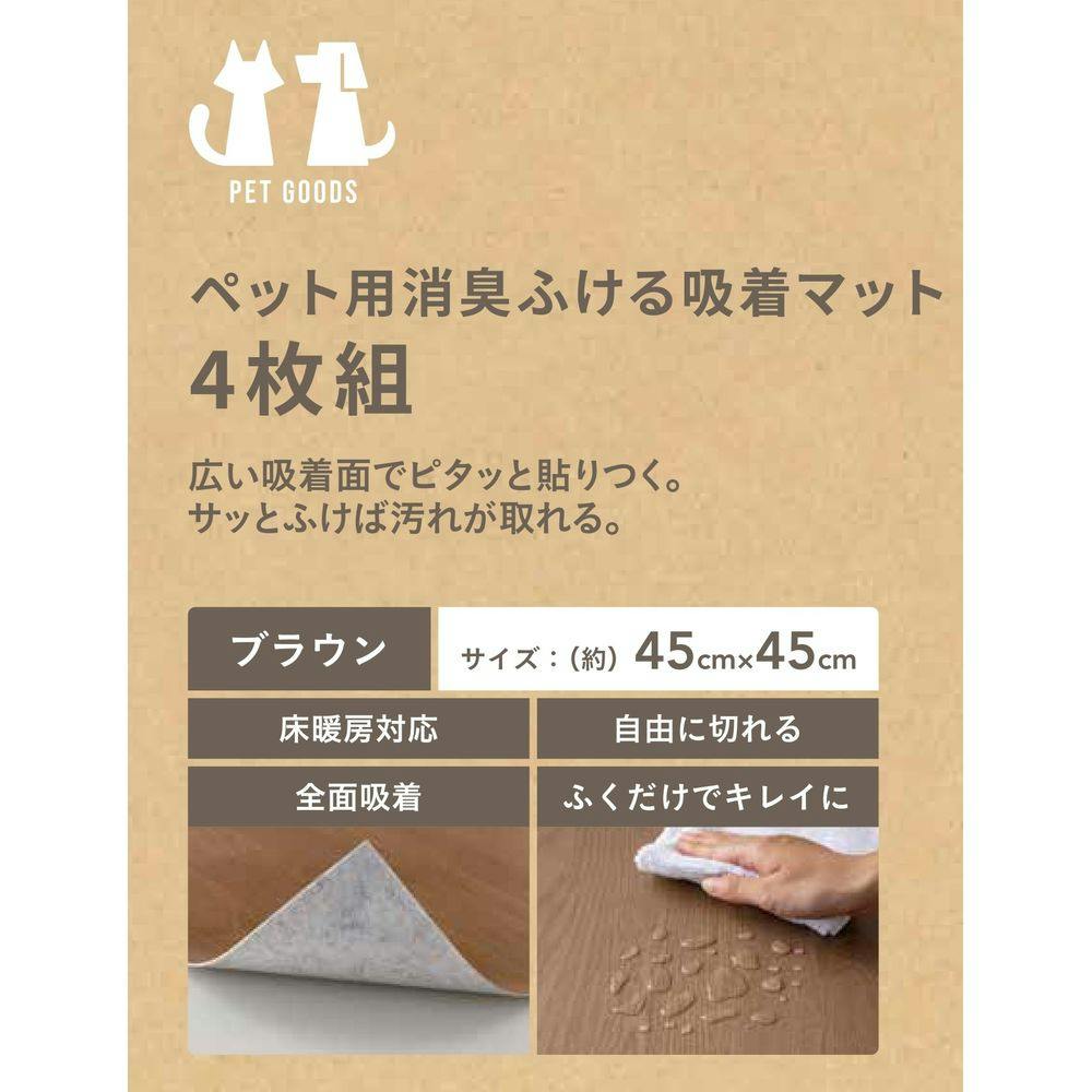 ペット用消臭拭ける吸着マット 4枚組 幅45cm 奥行45cm ブラウン