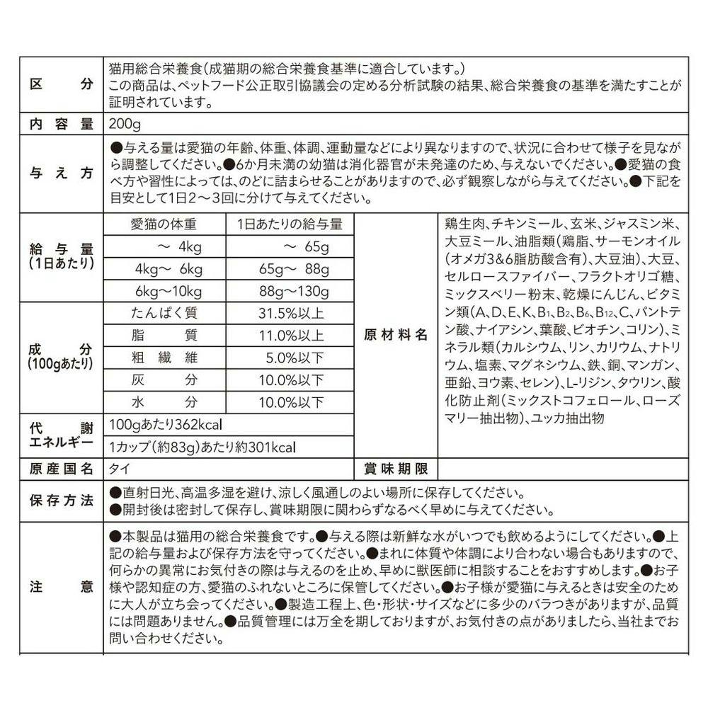 鶏生肉、チキンミール、玄米、ジャスミン米、大豆ミール、油脂類(鶏脂、サーモンオイル(オメガ3&6脂肪酸含有)、大豆油)、大豆、セルロースファイバー、フラクトオリゴ糖、ミックスベリー粉末、乾燥にんじん、など