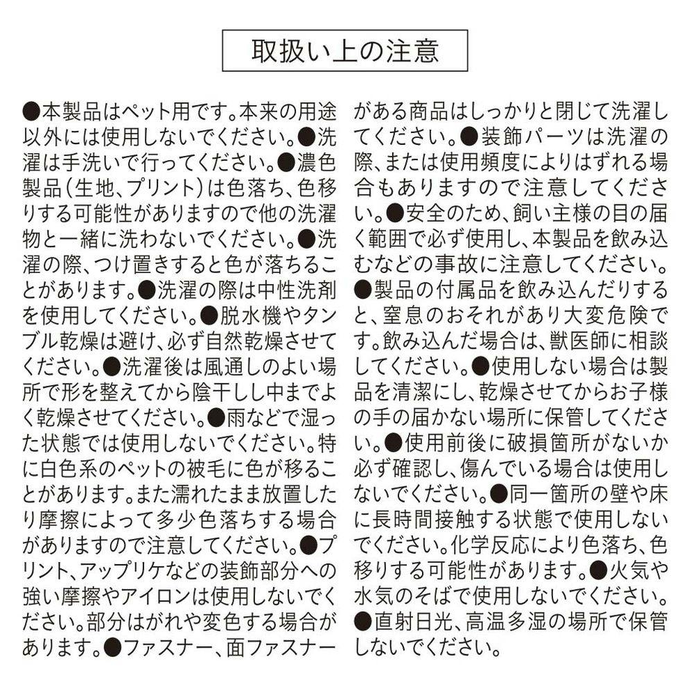●本製品はペット用です。本来の用途以外には使用しないでください。●洗濯は手洗いで行ってください。●濃色製品(生地・プリント)は色落ち、色移りする可能性がありますので他の洗濯物と一緒に洗わないでください。