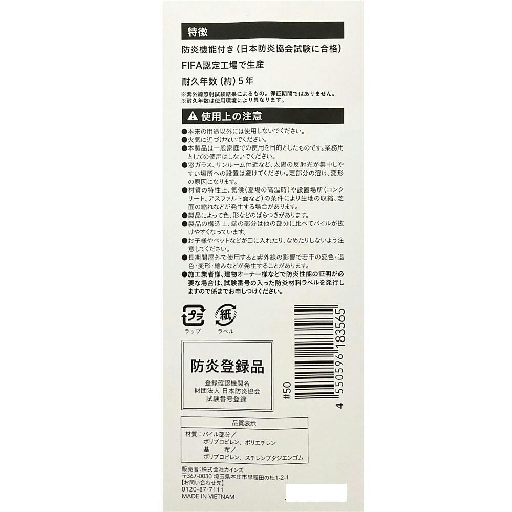 ●本物そっくりな人工芝!カインズの人工芝は、ここが違います。1.優れた品質「FIFA*公認工場製」(*国際サッカー連盟)2.安心・安全の「防炎機能」付き●防炎加工●透水穴付き●耐候年数:5年