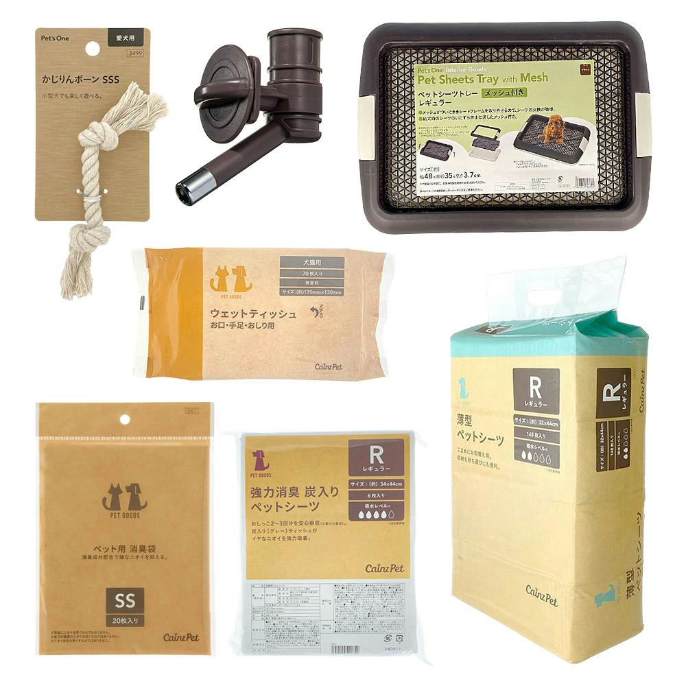 セット内容:●薄型ペットシーツ●ペットボトル給水器●メッシュ付きペットシーツトレー●犬用おもちゃ●ペット用消臭袋●ウェットティッシュ