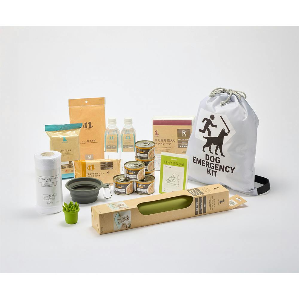 ペットシーツマット、炭入りシーツ、消臭袋、ボディタオル、折りたたみ食器、ウェットティッシュ、おもちゃ、マイクロファイバークロス、ペットのお水、缶詰、防災手帳、避難袋